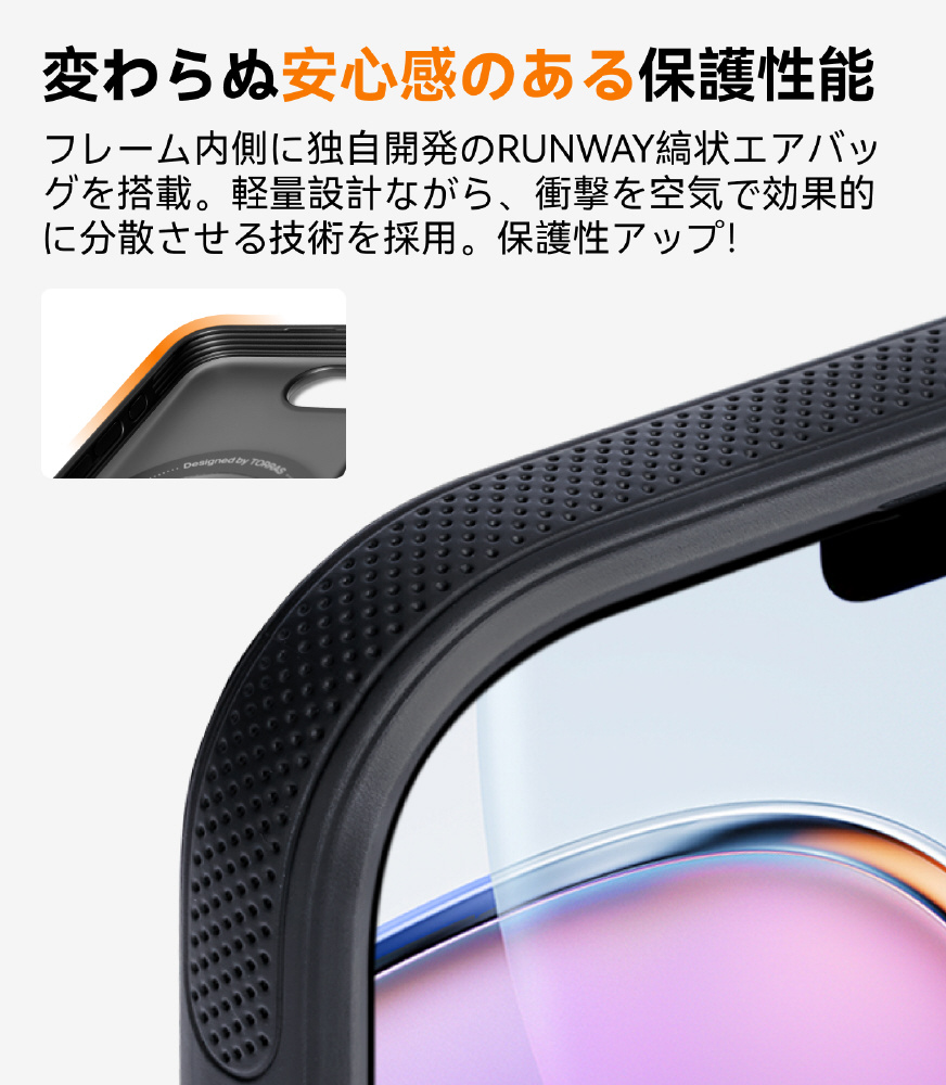 ・独自開発のRUNWAY縞状エアバッグにより、軽量設計で衝撃を効果的に分散し、大切なスマホを守ります。