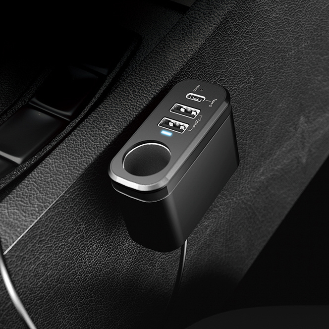 ソケットと急速充電に対応したUSB TYPE-Aポート2口・TYPE-Cポート1口を搭載してます