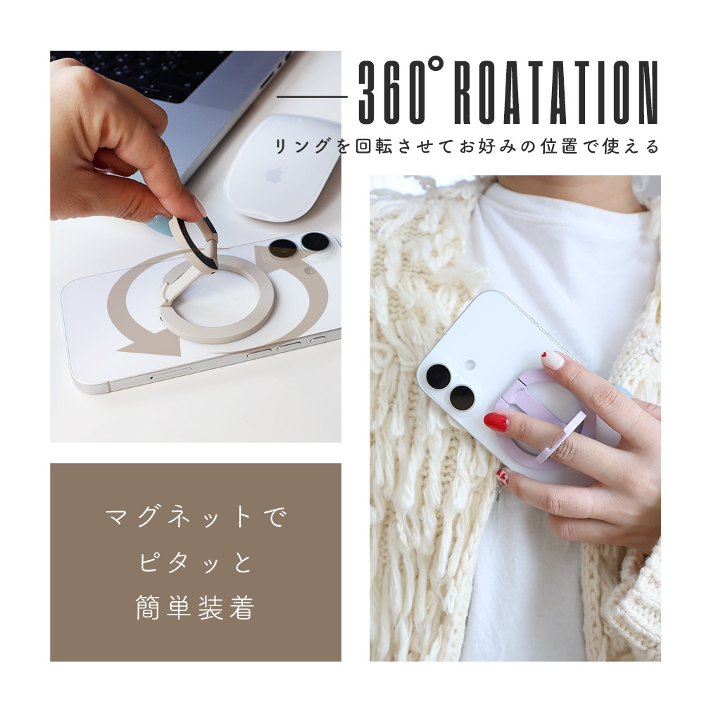 マグネットでピタッと装着できるスマホリングです。リング部分は360度好きな位置で固定でき、角度も自在に変えられるので、好みの位置に合わせて、左右どちらの手でスマホをもっても最適な位置に調整できます。