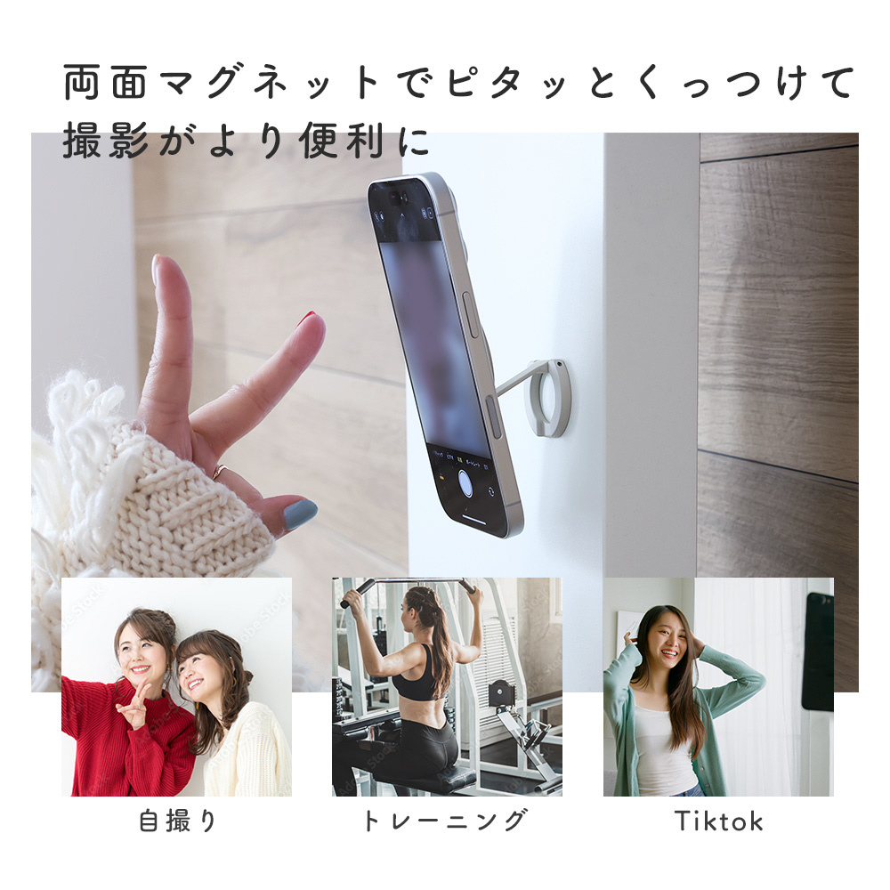 両面マグネットなので、磁石のくっつく場所であれば、どこでも固定して使用できるので、自撮り、定点撮影、Tiktokなどのショート動画撮影などに便利です。冷蔵庫や浴室、トレーニングジムマシン、車載ホルダー、ホワイトボード、街灯、フェンスや金属製ブラケットなど、どんなシーンでもマグネットでピタッとくっつけて撮影が可能です。