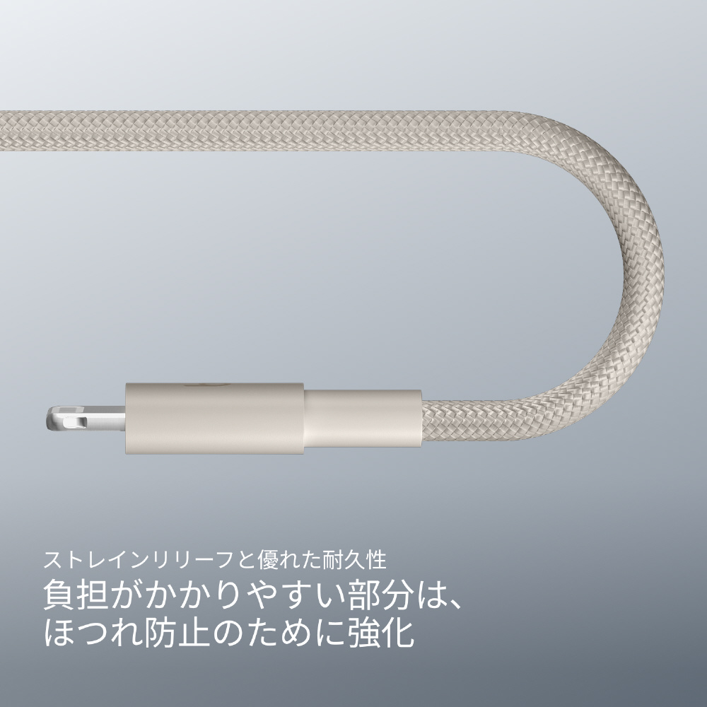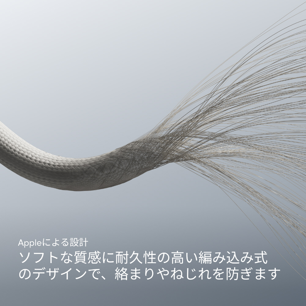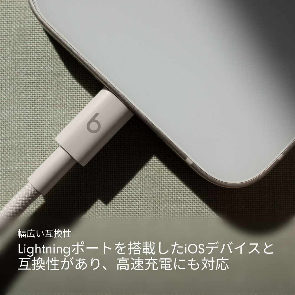BeatsのUSB-C - Lightning充電ケーブル(1.5m)はLightingポートを持つiOSデバイスに対応。絡まりにくい編み込み式のデザインで、優れた耐久性と使いやすさを兼ね備えています。