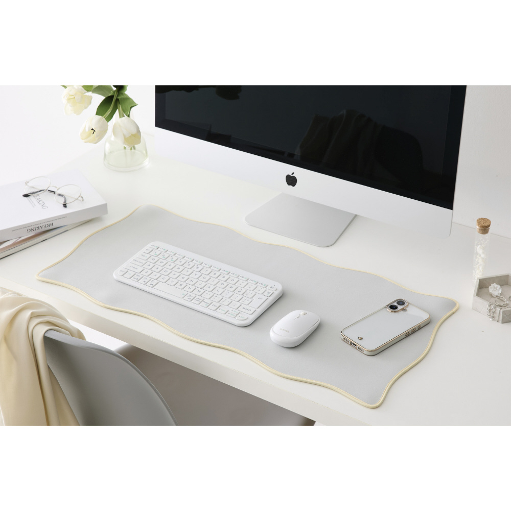 デスクに彩りと快適さをプラス。波のようなウェーブラインが個性的なデスクマットです。2色のコントラストが美しいバイカラーデザインで、デスクを華やかに彩ります。広々としたサイズでノートパソコンやキーボードをまとめて置け、マウス操作も快適。デスクを傷から守りつつ、きれいに保てます。
