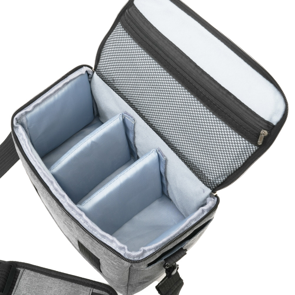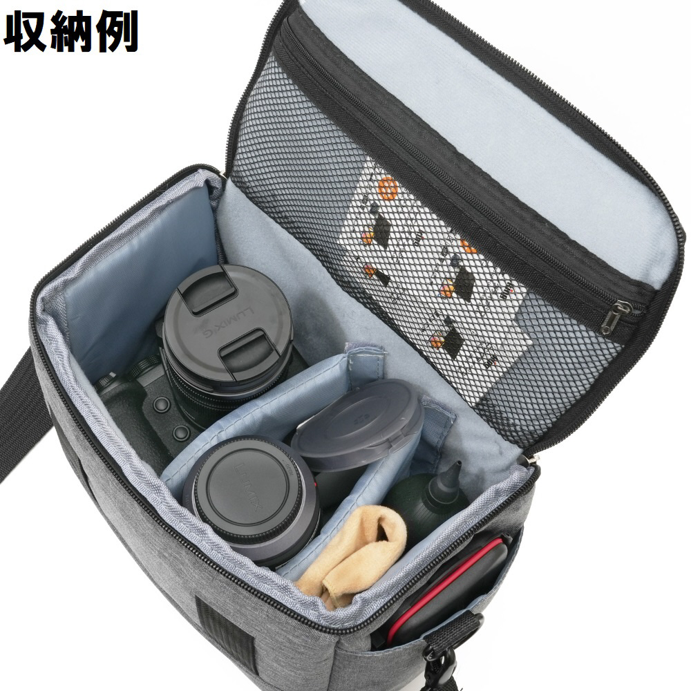 ミラーレスカメラとレンズの収納に最適な5.7?容量のカメラバッグです。ほどよいクッション性でカメラをしっかり保護します。メインの収納スペースには中仕切りが2枚付属しており、機材に合わせて位置を調整可能。上蓋内面にはメッシュの収納を備えており、SDカードやバッテリーなど収納することが可能です。バッグ上部の持ち手を掴んでの持ち運びのほか、付属のショルダーベルトをつけてショルダーバッグとしても使用できます。また、背面のベルト通しで腰のベルトを固定することで、取出しから撮影のレスポンスの良いウェストバッグとして、使用することも可能です。