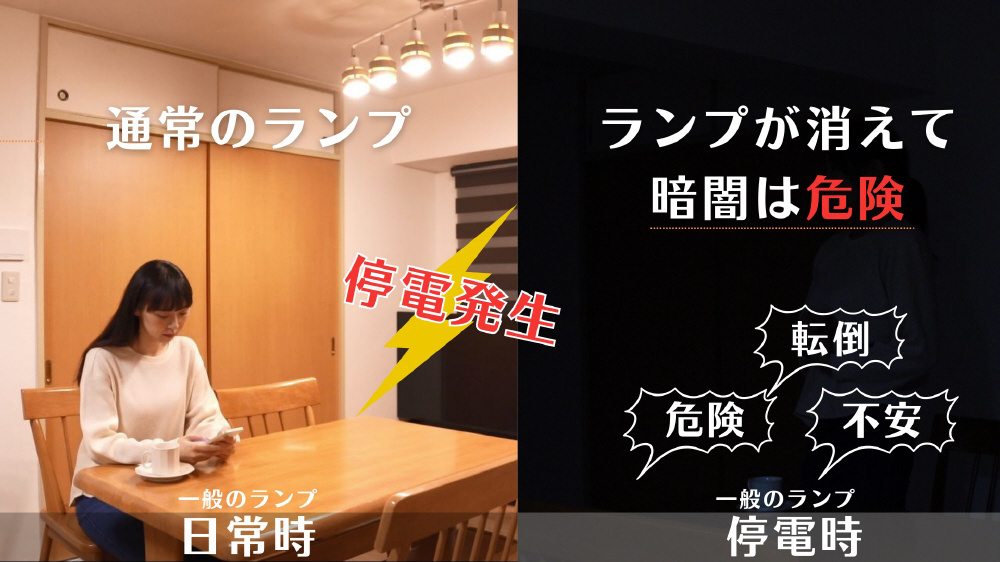 ふだん使いの延長線上にある防災LED電球。通常であれば特別な工事や費用がかかる非常用(停電時)の照明確保が、安価で誰でも簡単に取付(電球の差替え)ができます。
