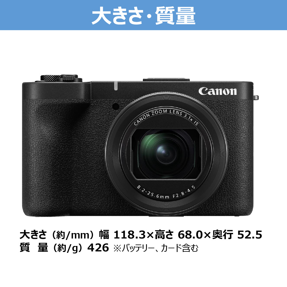 ・本格的な撮影性能を大きさ約118.3(幅)×68.0(高さ)×52.5mm(奥行き)、質量約426gのコンパクトボディーに凝縮し、旅行などでの撮影にも好適。