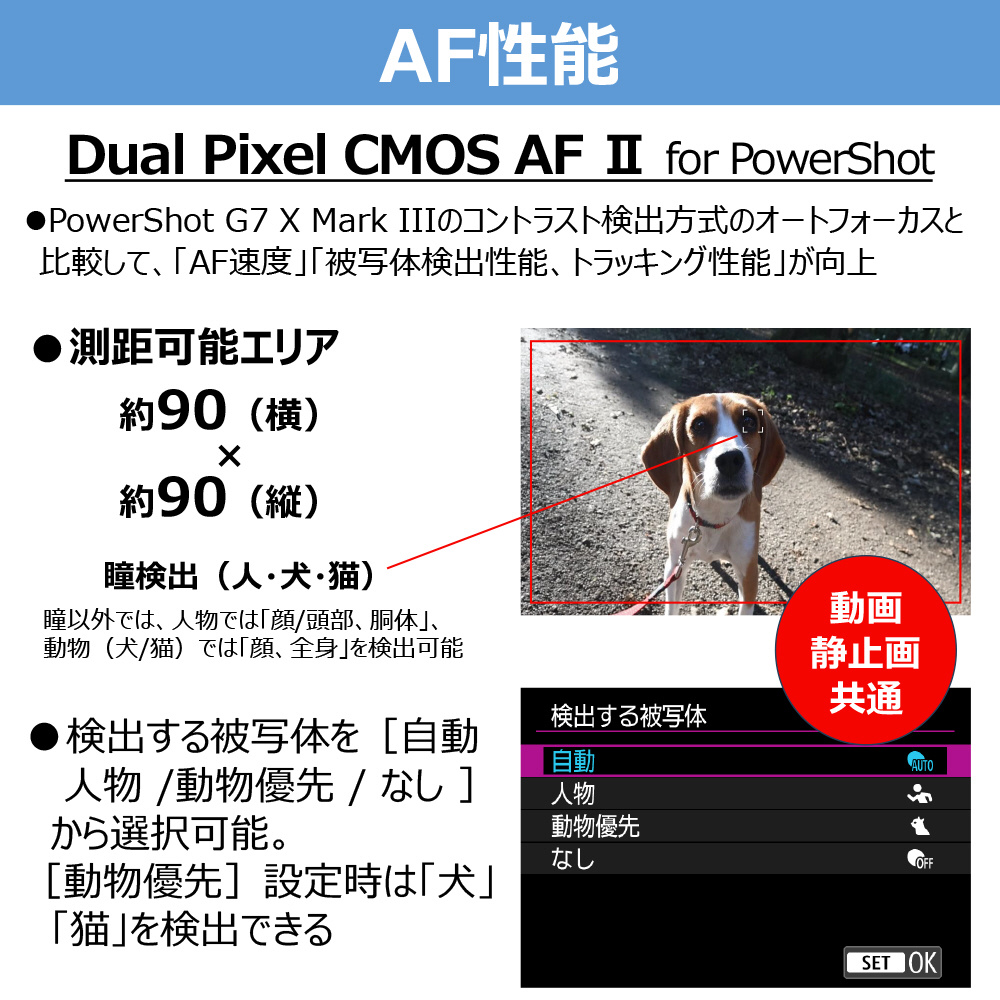 ・「デュアルピクセルCMOS AF II for PowerShot」により、「PowerShot G7 X Mark III」(2019年8月発売)のコントラスト検出方式のAFと比較し、AF速度、被写体検出性能、トラッキング性能が向上。