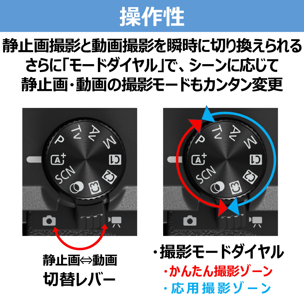 ・静止画撮影と動画撮影をワンタッチで切り替えられる「静止画撮影/動画撮影切り換えスイッチ」や、撮影モードを簡単に変更できる「モードダイヤル」を搭載。