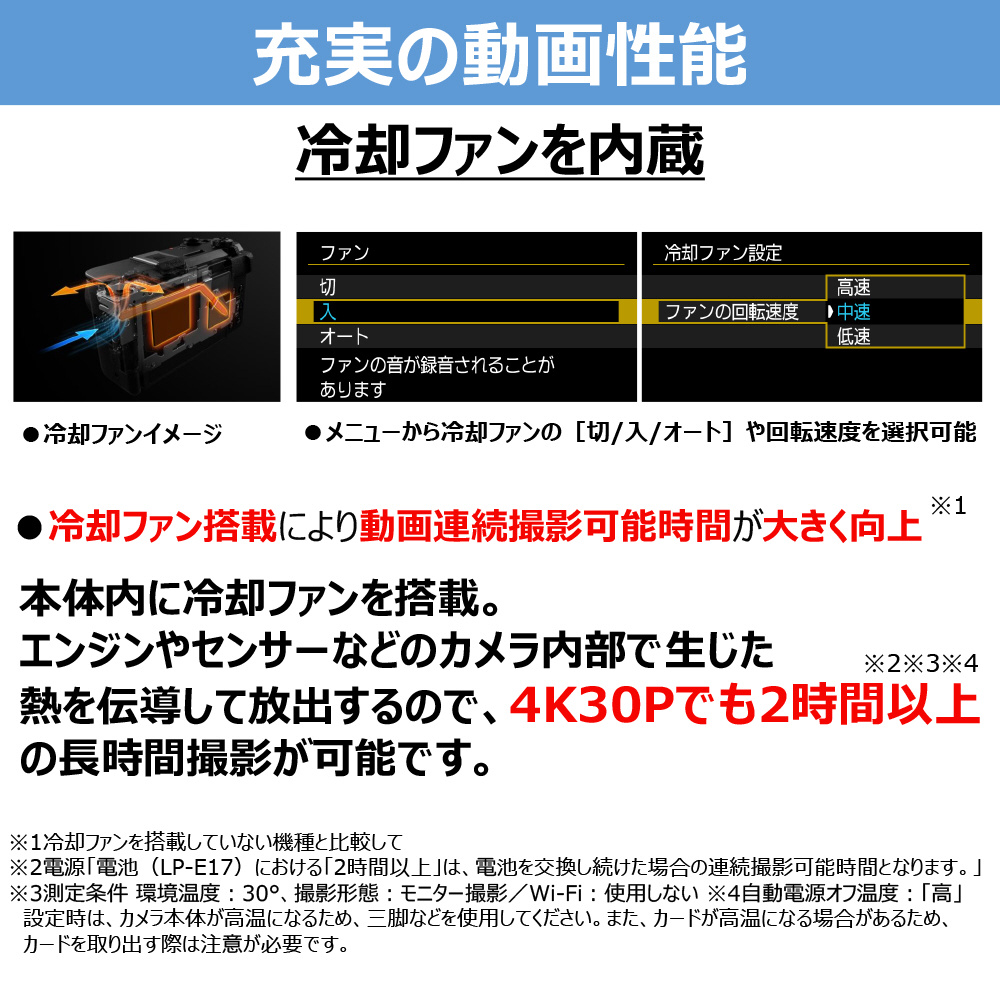 ・本体内部に冷却ファンを搭載し、熱を効率的に放出することで、動画撮影時において、温度上昇による撮影時間への影響を低減しながら、撮影することが可能。