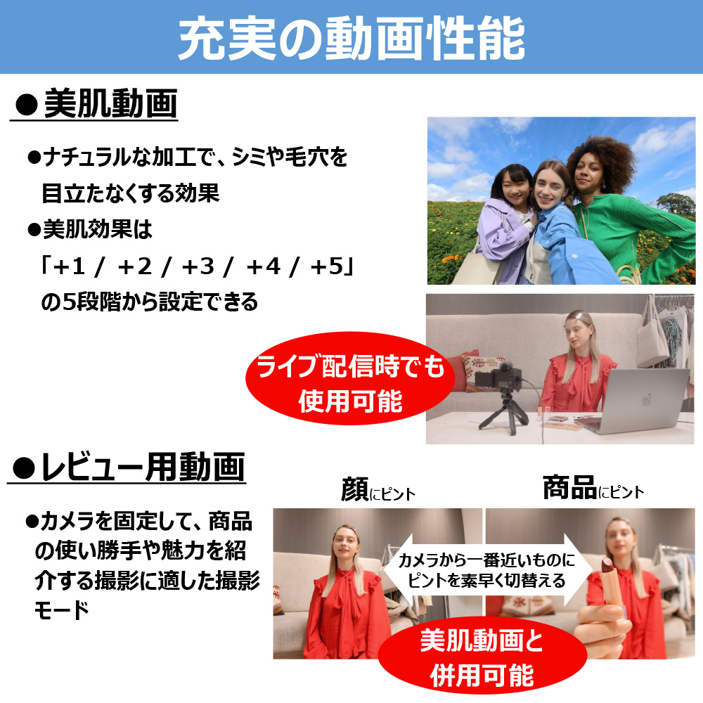 ・カメラから一番近い被写体にピントを合わせ商品紹介に適した「レビュー用動画」、歩きながらでの動画撮影でも手ブレを抑え、自然な映像を実現する「手ブレ補正動画」、ナチュラルな加工で肌を滑らかに補正する「美肌動画」などの撮影モードにより、快適な動画撮影を実現。