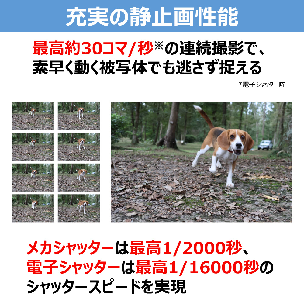 ・電子シャッター時、最高約30コマ/秒、メカシャッター時、最高約15コマ/秒の連続撮影を実現し、被写体や撮影環境に応じたシャッター方式を選択し、素早く動く被写体の撮影が可能。