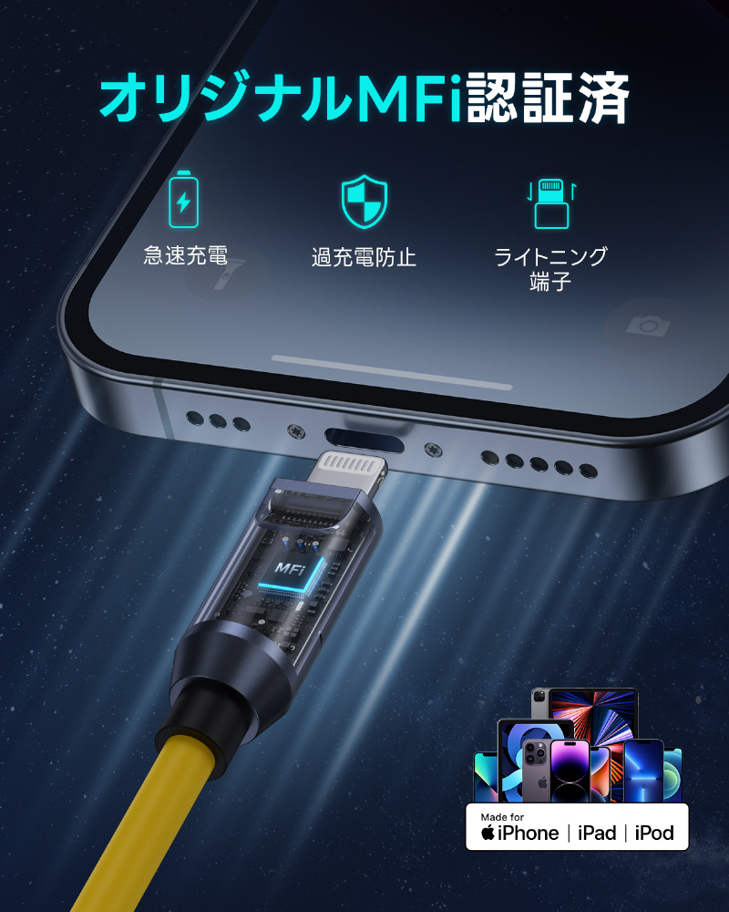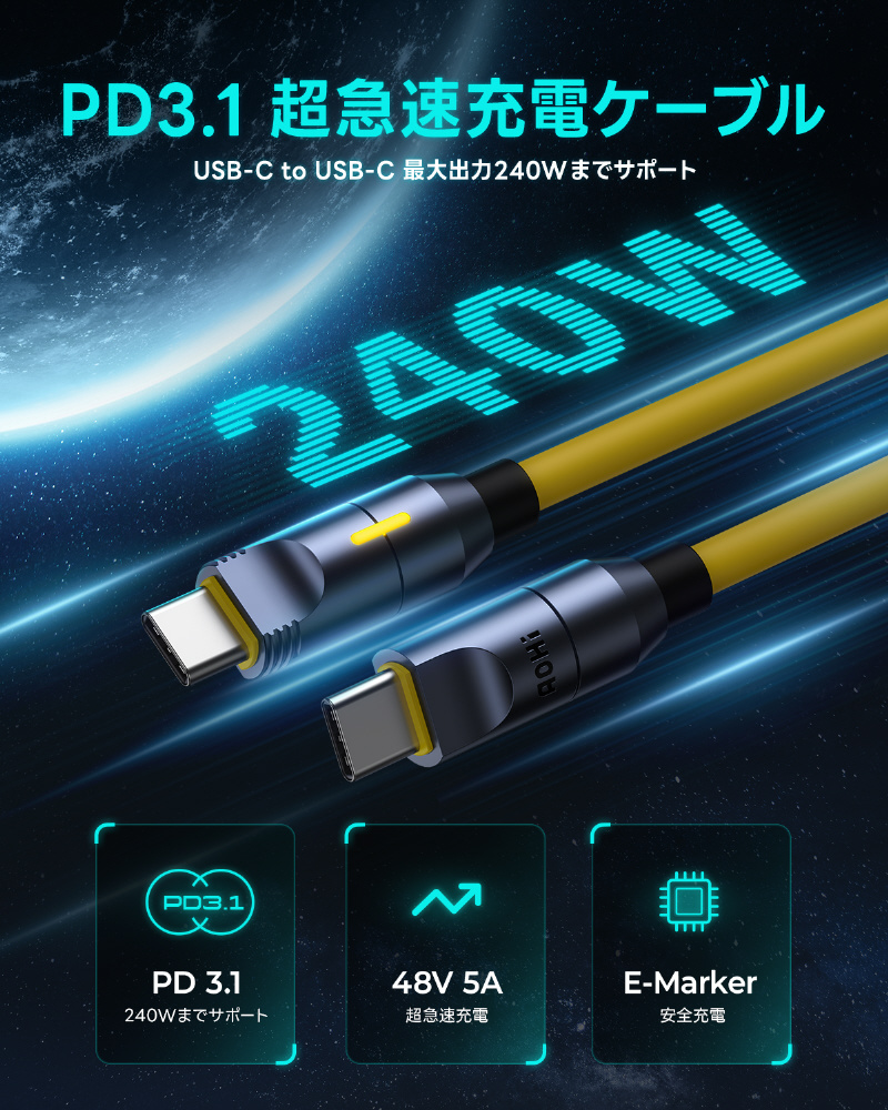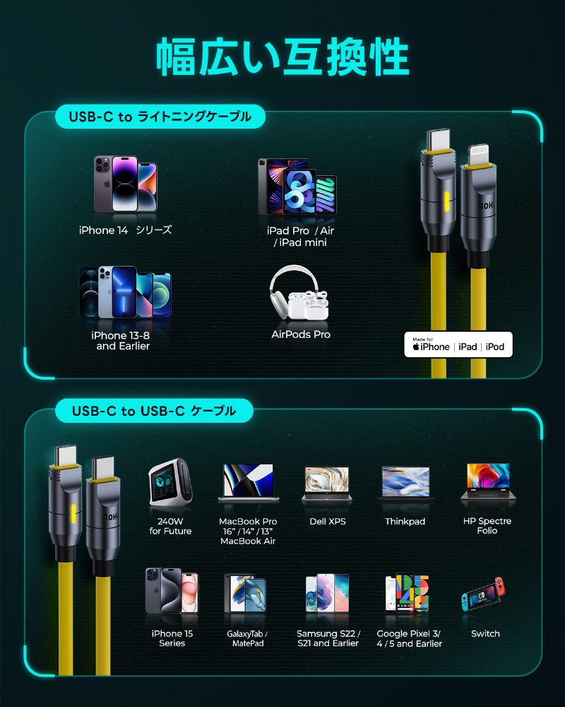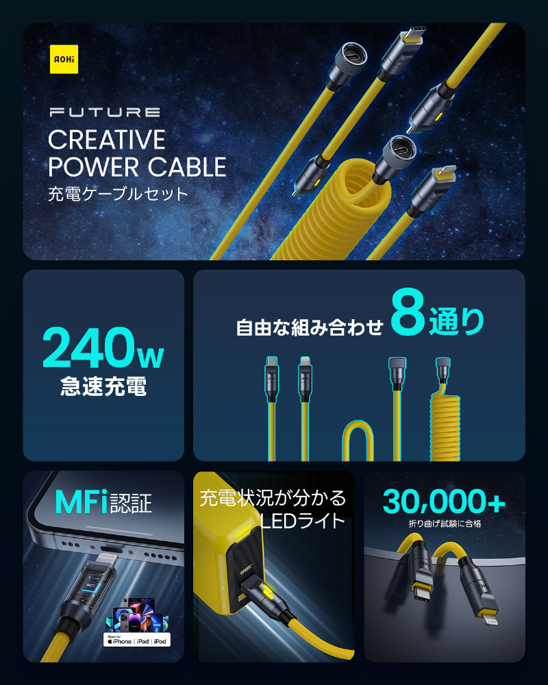 【ケーブルセット】AOHI FUTURE PRO パワーケーブルセット 240W PD3.1搭載 USB C-C,USB C-Lighting 最大480Mbpsデータ転送