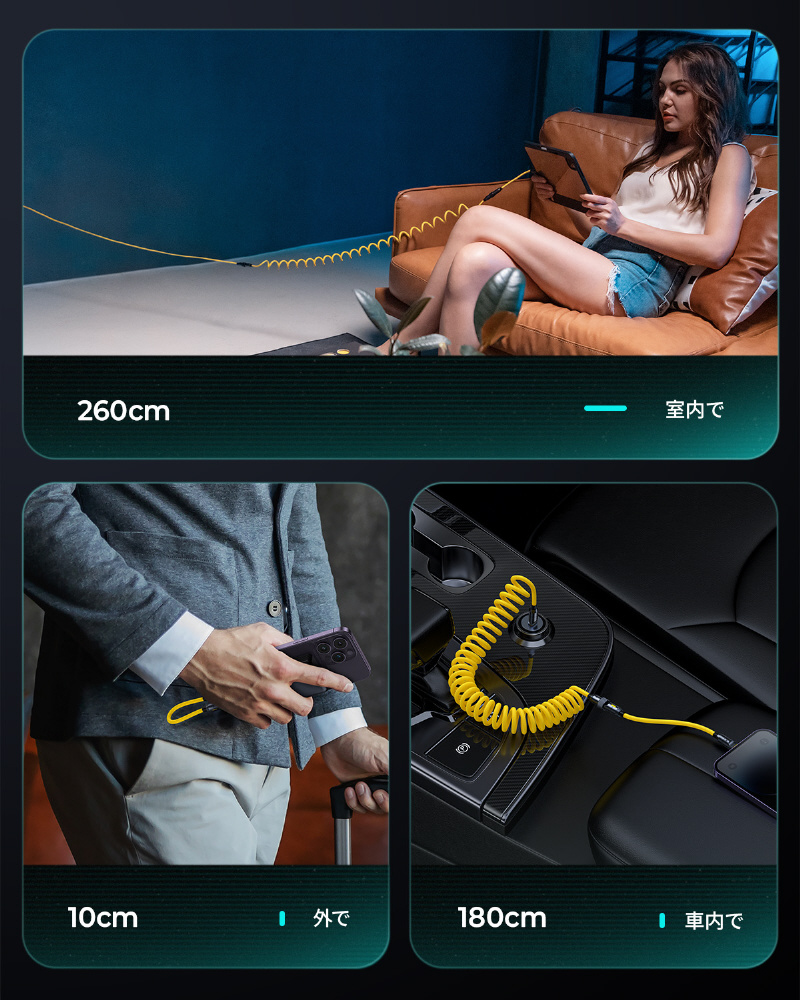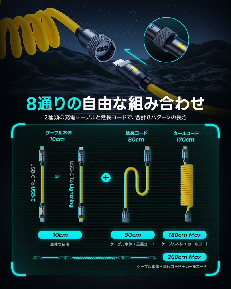 ケーブル長C-C/0.1m,延長コード/0.8m,カールコード/1.7m コネクタ USB C-C,USB C-Lighting