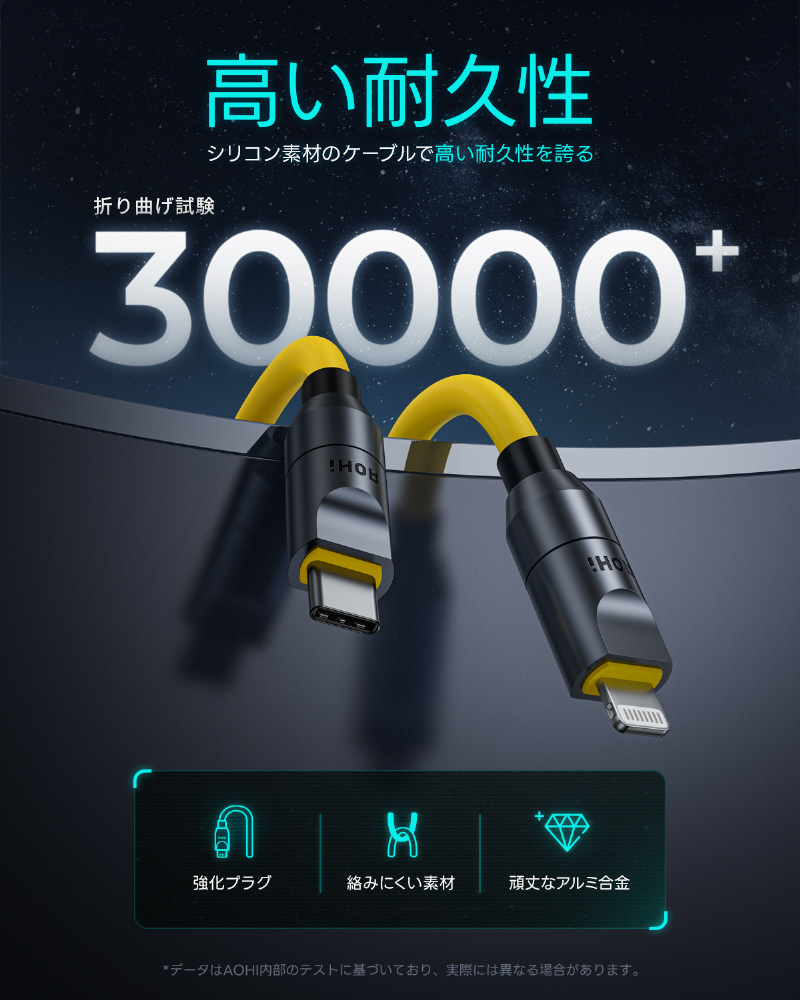 シリコン素材のケーブル、アルミ合金プラグ、30,000回の曲げ実験