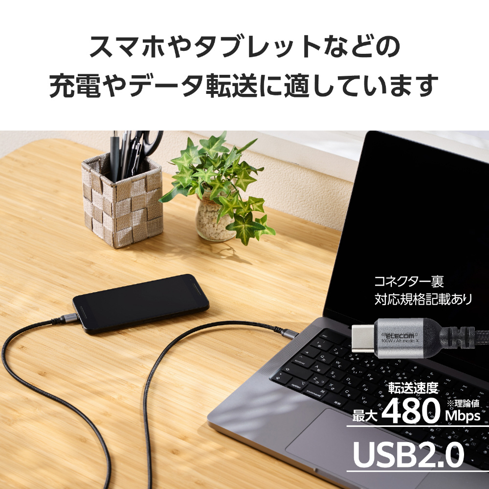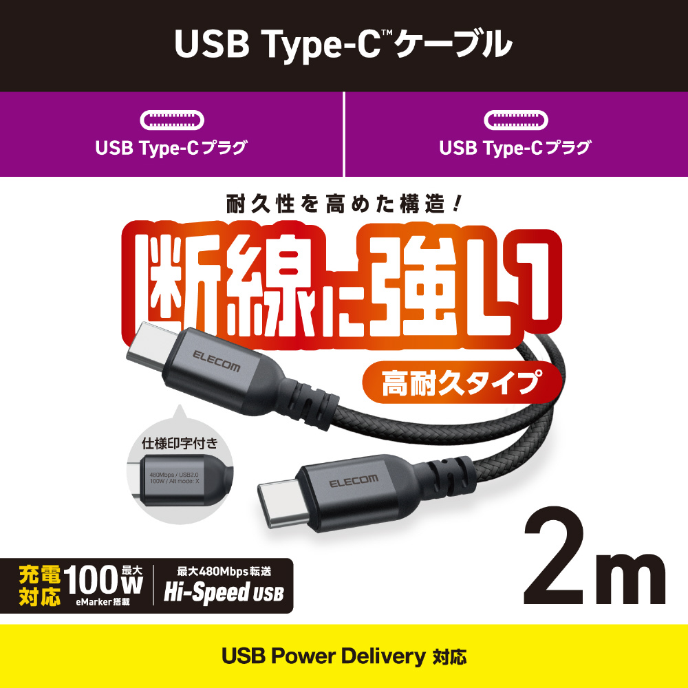 スマートフォンもパソコンも、これ1本で高速充電!USB2.0、USB Power Delivery(最大100W)対応のUSB Type-C(TM) - USB Type-Cケーブル。断線に強い高耐久タイプです。