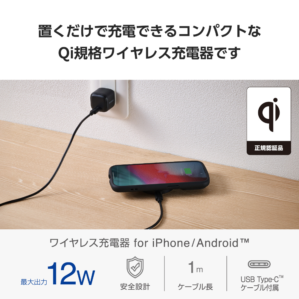 ワイヤレス充電器 Qi 認証 12W / 10W / 7.5W / 5W 卓上 充電器 ケーブル付属 1m 置くだけ充電 薄型 コンパクト 【 iPhone AirPods Android Pixel Xperia Galaxy 等対応 】 ブラック W-QA28BK