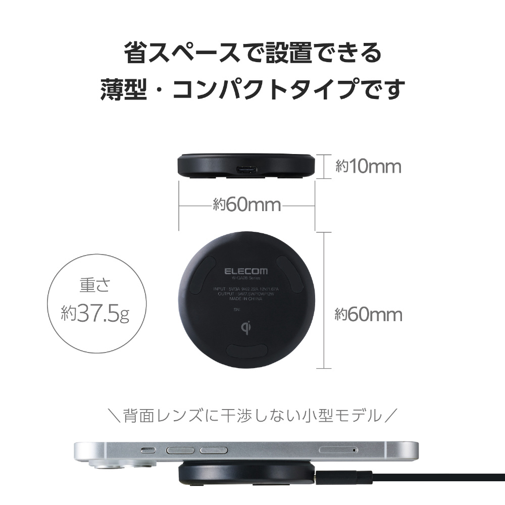 対応するAndroidやiPhoneを置くだけで充電できる、Qi規格ワイヤレス充電器です。手のひらサイズで持ち運びに便利。天面に滑り止めパッドを配置しており、スマートフォン本体への傷やバイブレーションによる滑り落ちを抑制します。USB Power Delivery対応のAC充電器を接続することで最大12Wの高速充電が利用できます。