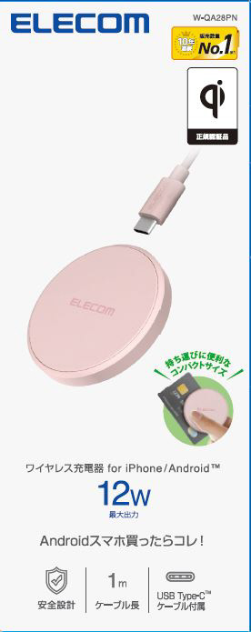 ワイヤレス充電器 Qi 認証 12W / 10W / 7.5W / 5W 卓上 充電器 ケーブル付属 1m 置くだけ充電 薄型 コンパクト 【 iPhone AirPods Android Pixel Xperia Galaxy 等対応 】 ピンク W-QA28PN
