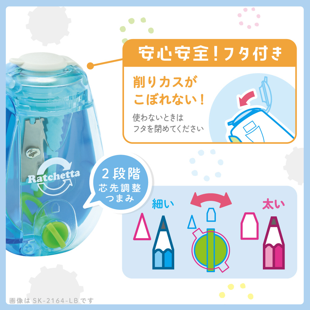 左右交互にひねるだけで、にぎりなおさず削れるらくらくラチェット式ハンディ鉛筆削り。初めて鉛筆を使うお子さんにも扱いやすい、カンタンな動作で削れるハンディ鉛筆削り。削りあがりを選べる2段階の芯先調整機能付で、色えんぴつにもおすすめです。フタ付で、使わないときは閉めておけば削りカスがこぼれる心配がありません。開閉しやすい側面ダストカバーでゴミ捨てもラクラク。