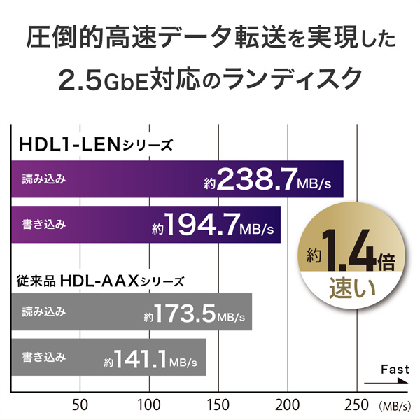 2.5GbEに対応し、読み込み時は最大238.7MB/s、書き込み時には194.7MB/sの高速データ転送を実現した商品です。