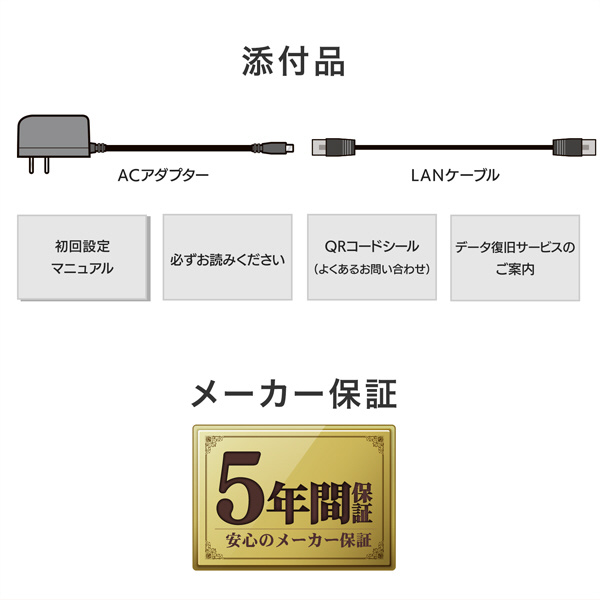 付属品 必ずお読みください、初回設定マニュアル、ACアダプター、LANケーブル、QRコードシール(よくあるお問い合わせ)、データ復旧サービスのご案内