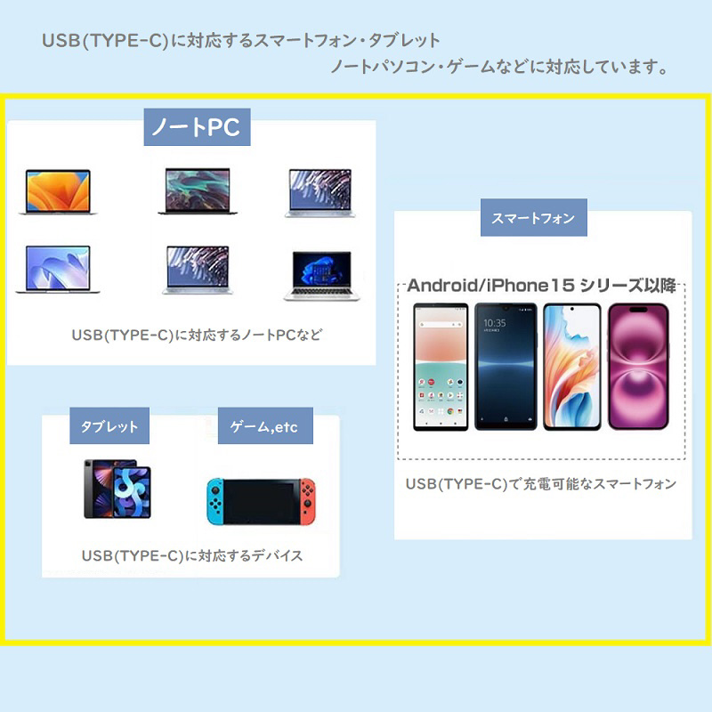 USB-Cに対応するスマートフォン・タブレットPC・ノートパソコン・ゲームなど