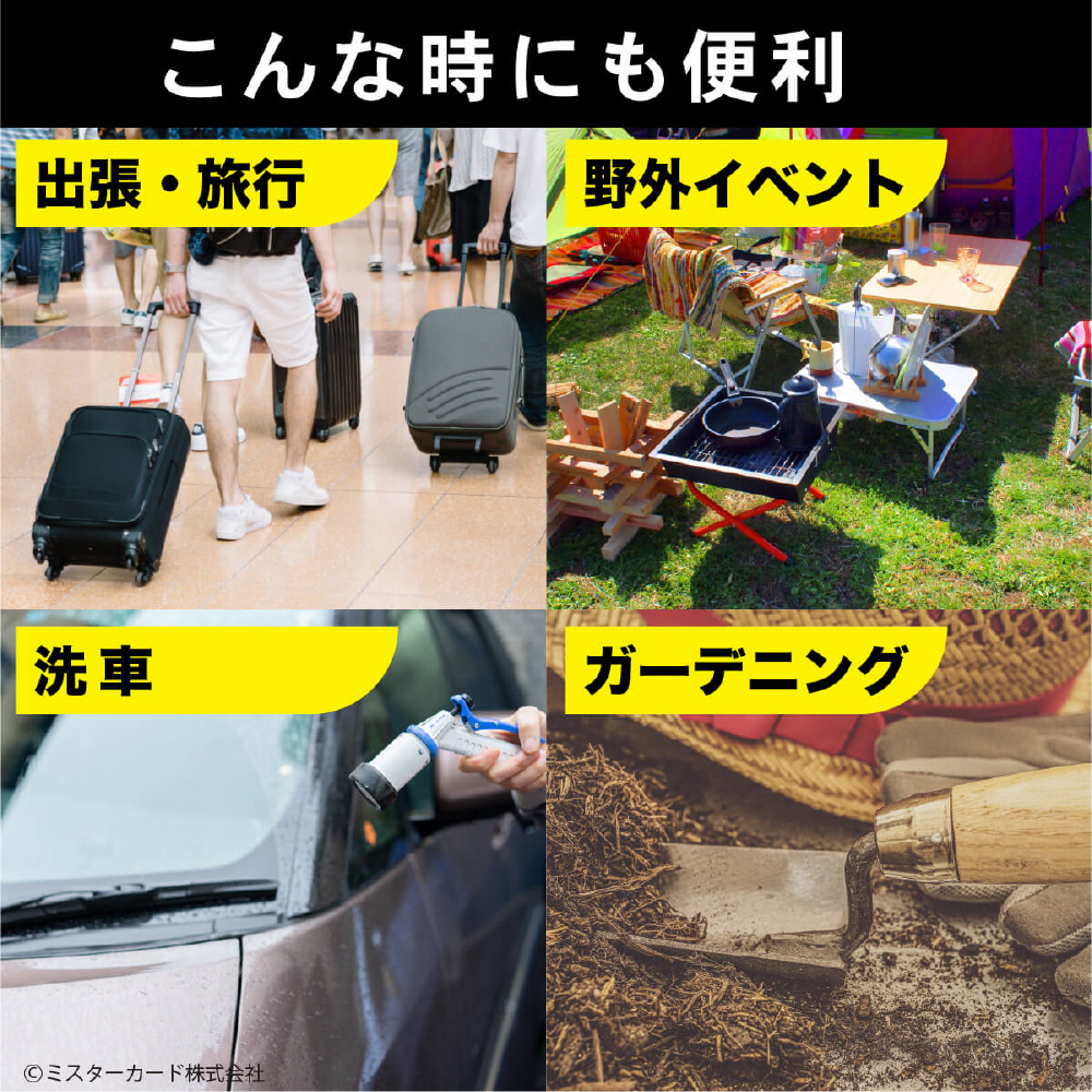 雨・雪・泥地での防護、自転車・バイク走行時、車やバイクの洗車時、お風呂掃除、旅行や出張、