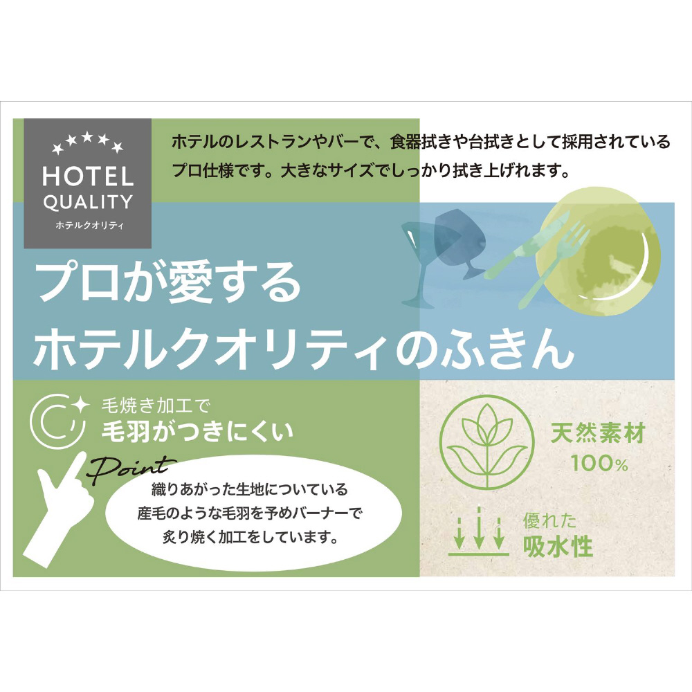 プロが愛用するホテルクオリティのふきん。ワイングラスやコップ拭きに最適な綿100%のグラスふきんです。グラスだけでなく、食器拭きにもご利用いただけます。綿100%なので肌触りがよく、吸水性に優れています。グラスに毛羽が残りにくいふきんです。※最初は毛羽が付く場合がありますので、一度洗ってからご使用ください。