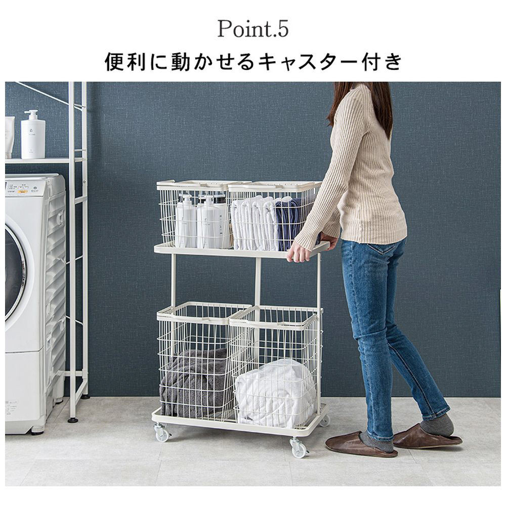 色柄物や汚れた洗濯物を分けて溜められるランドリーワゴン。バスケットは持ち運べて便利。