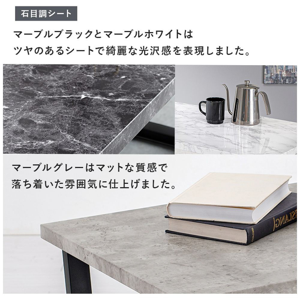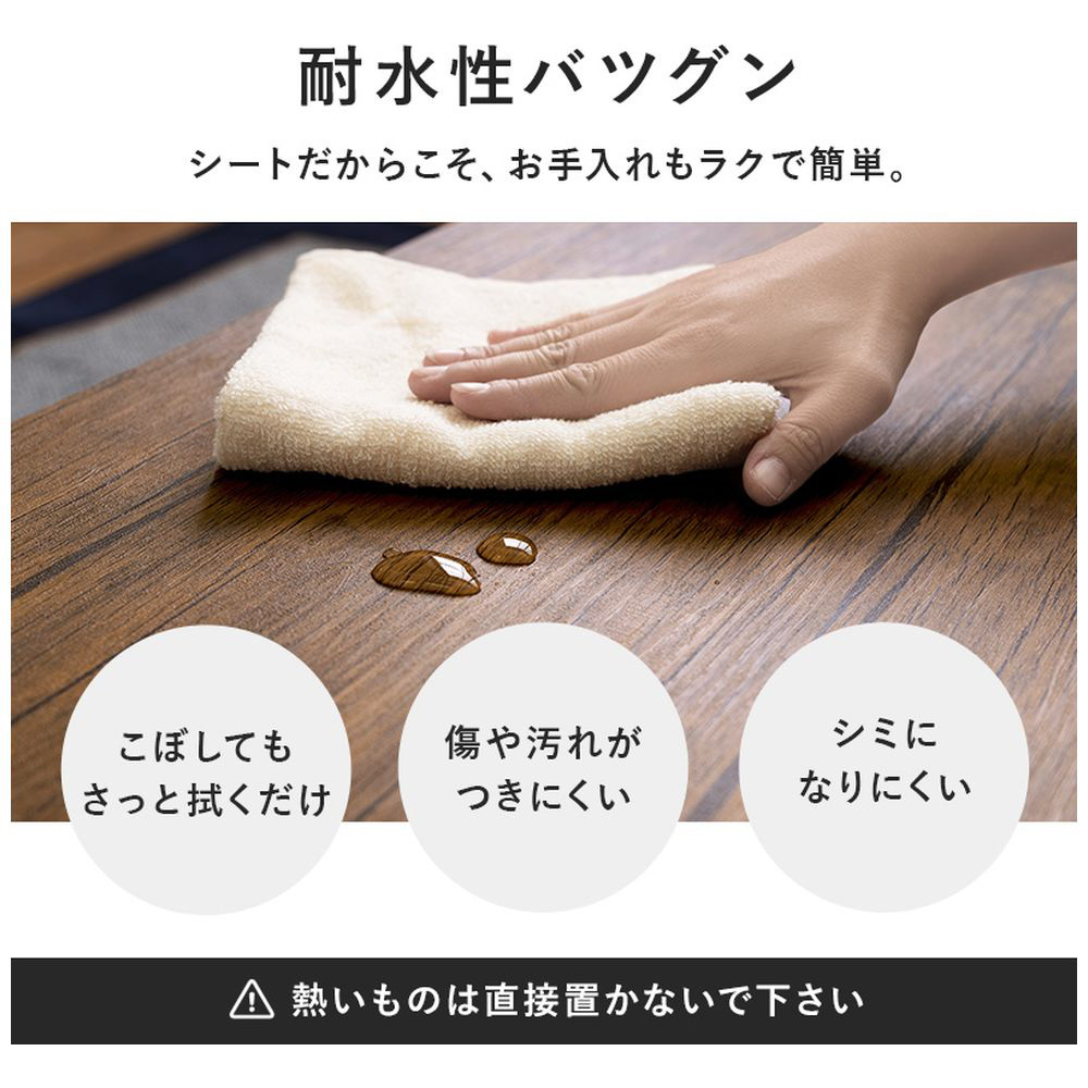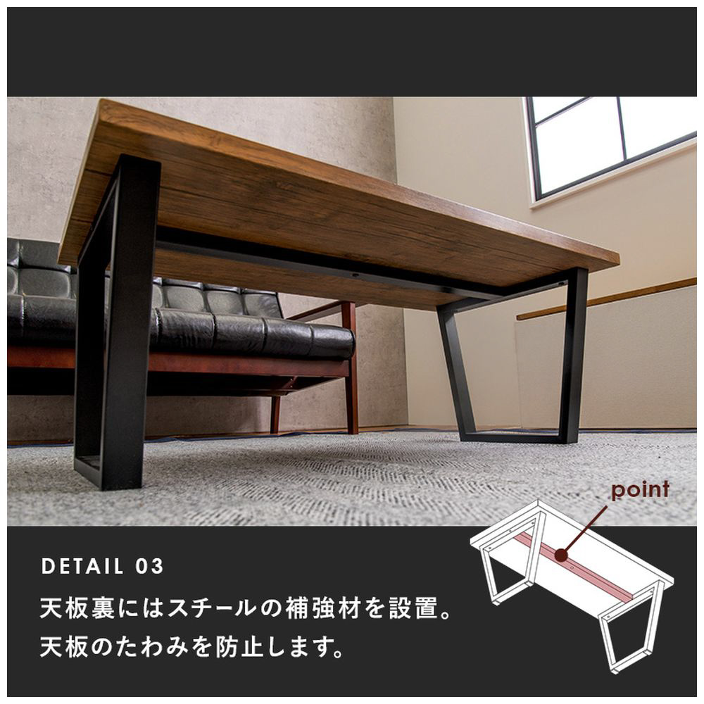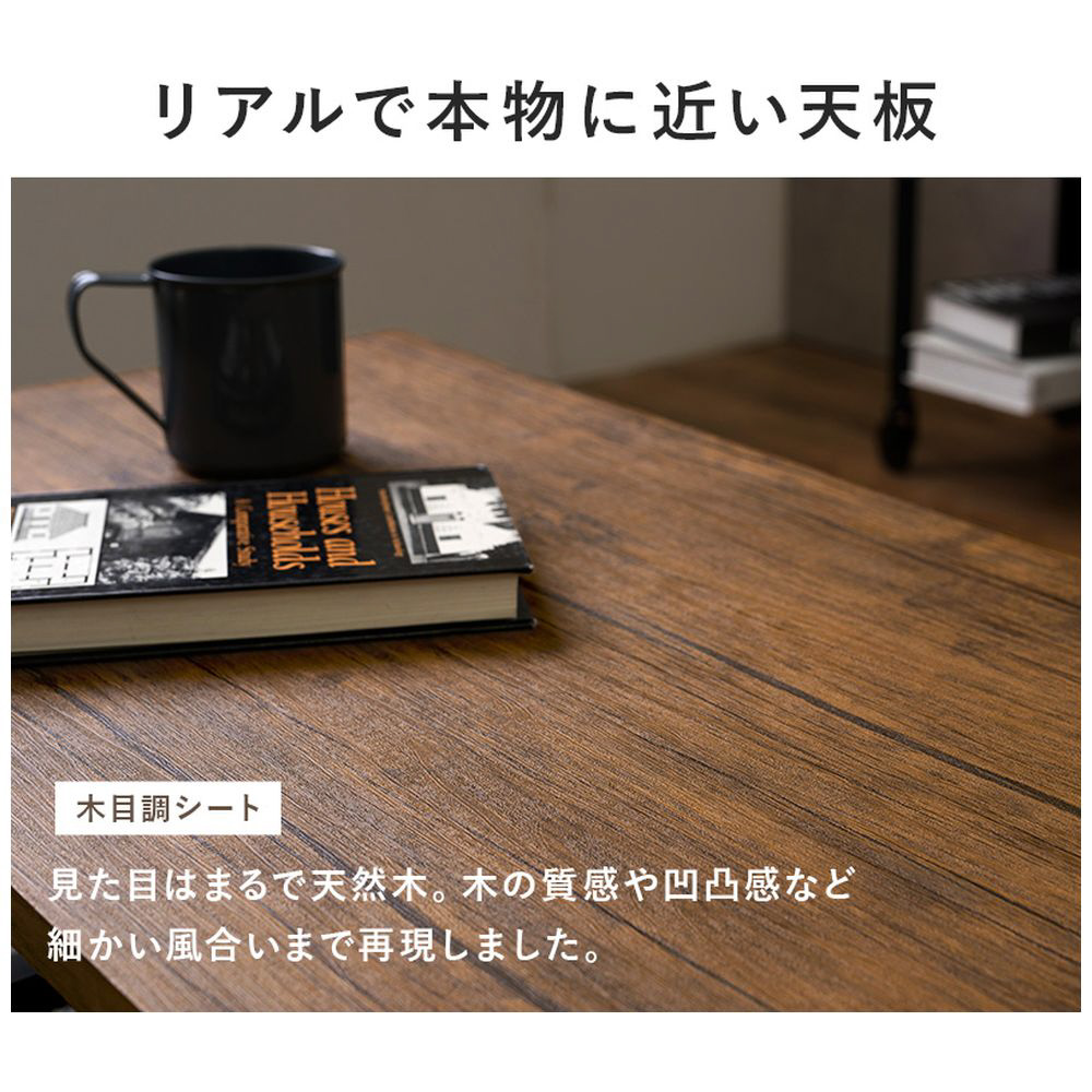 木の質感や凹凸感まで表現したリアルな天板。スチール脚とのコントラストで、お部屋のインテリアとしての存在感を発揮します