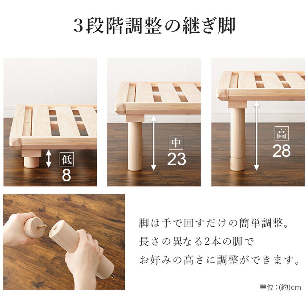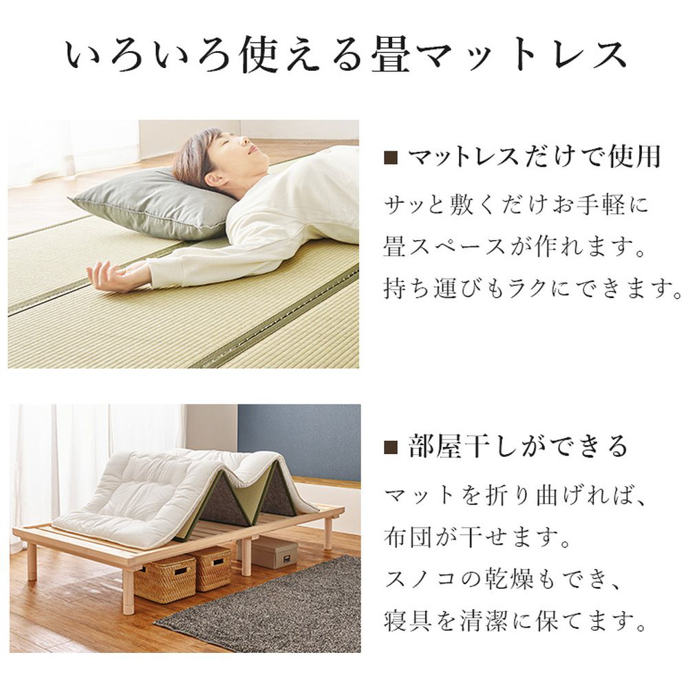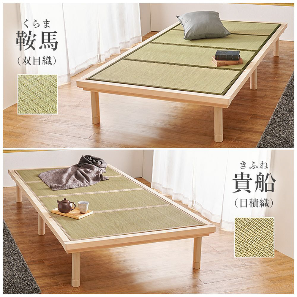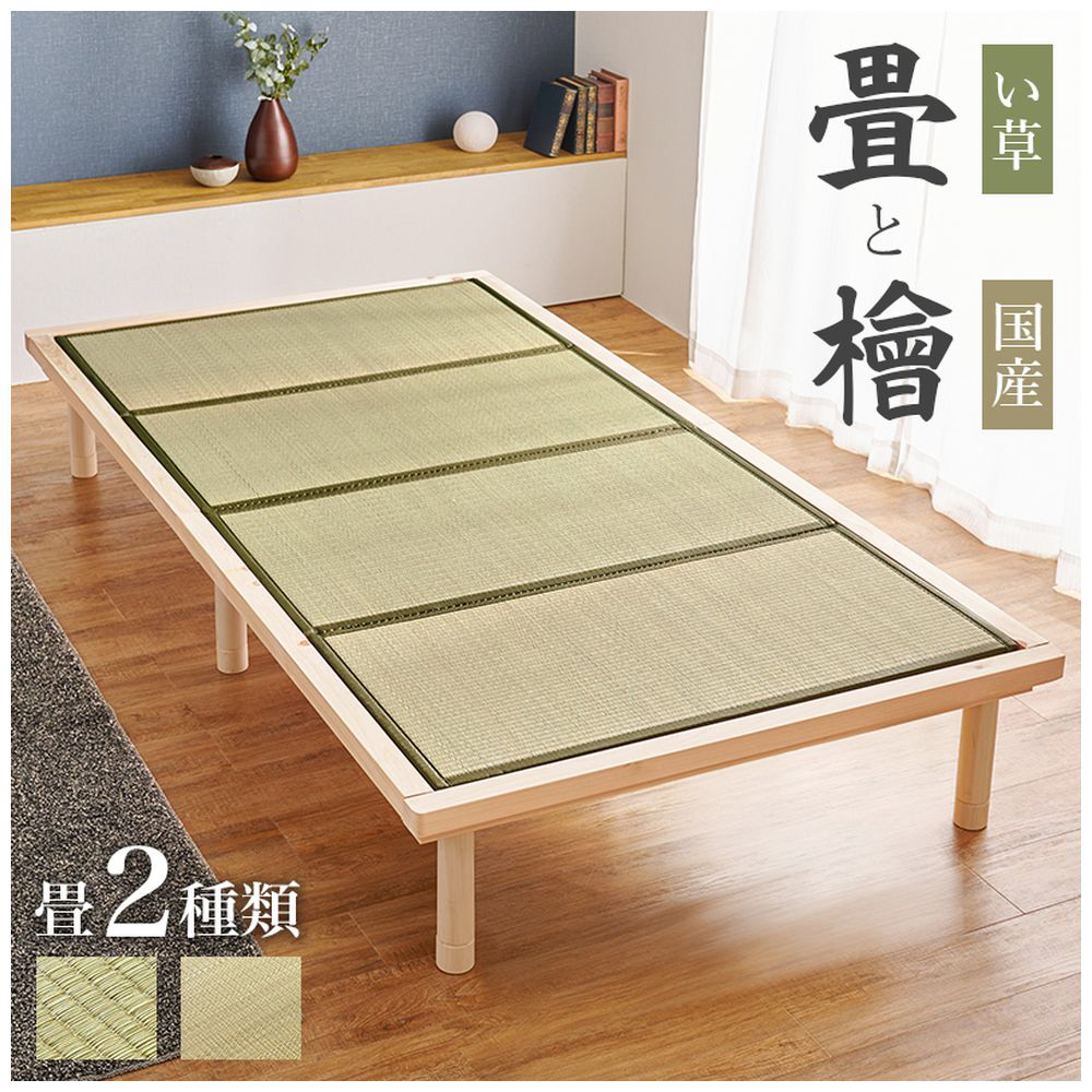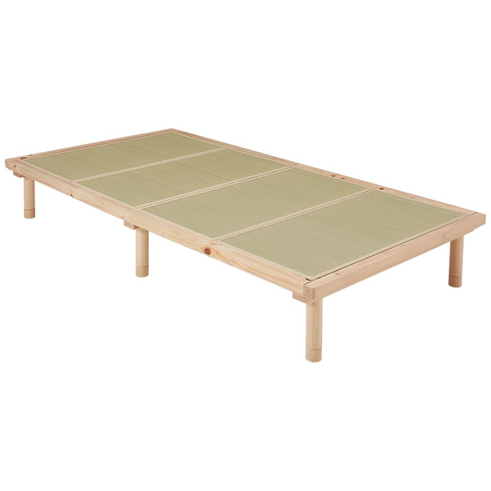 檜(ひのき)の香りや風合いを感じられるすのこベッドに爽やかな天然い草を使用した畳マットを合わせました。敷布団が使えるロングサイズで床面高さは3段階調整が可能。