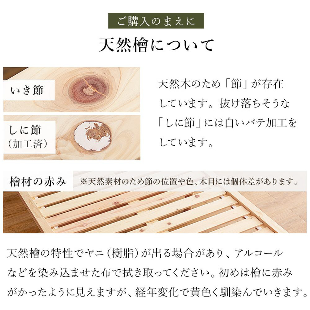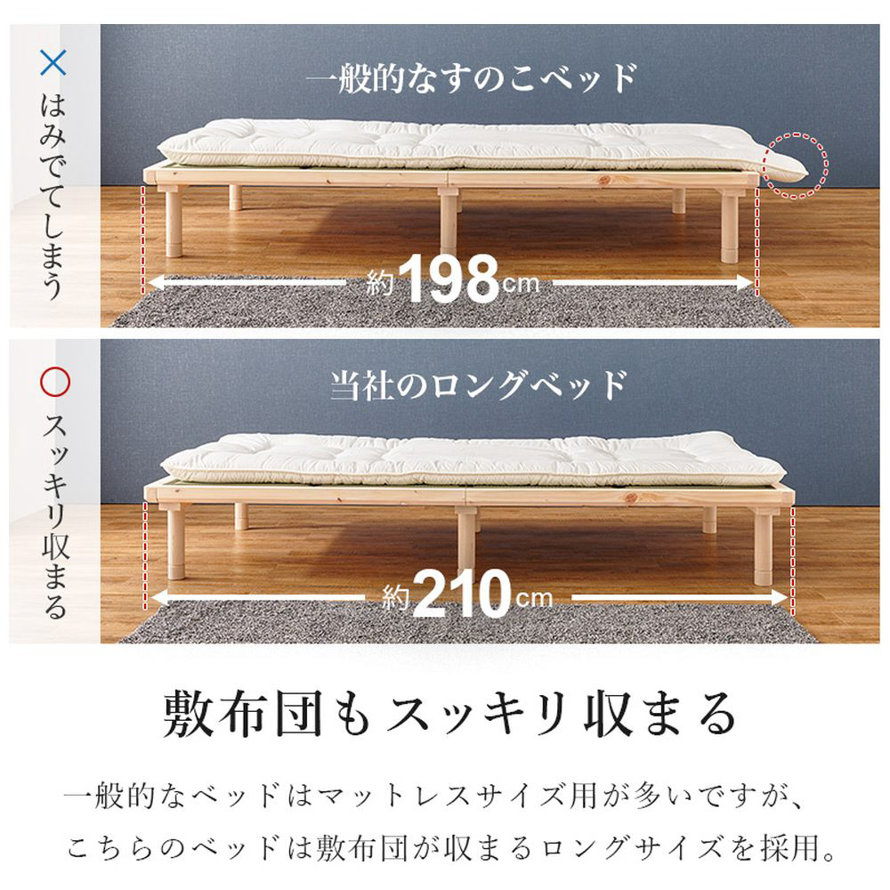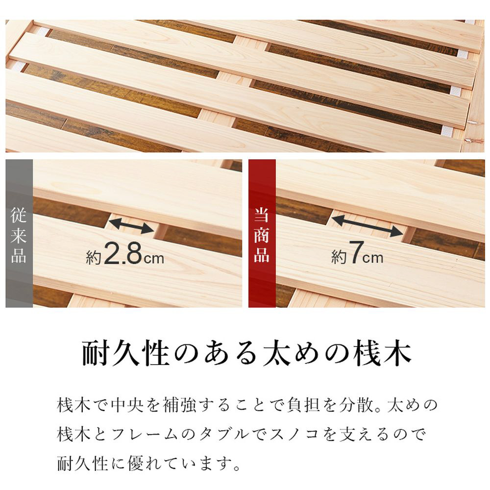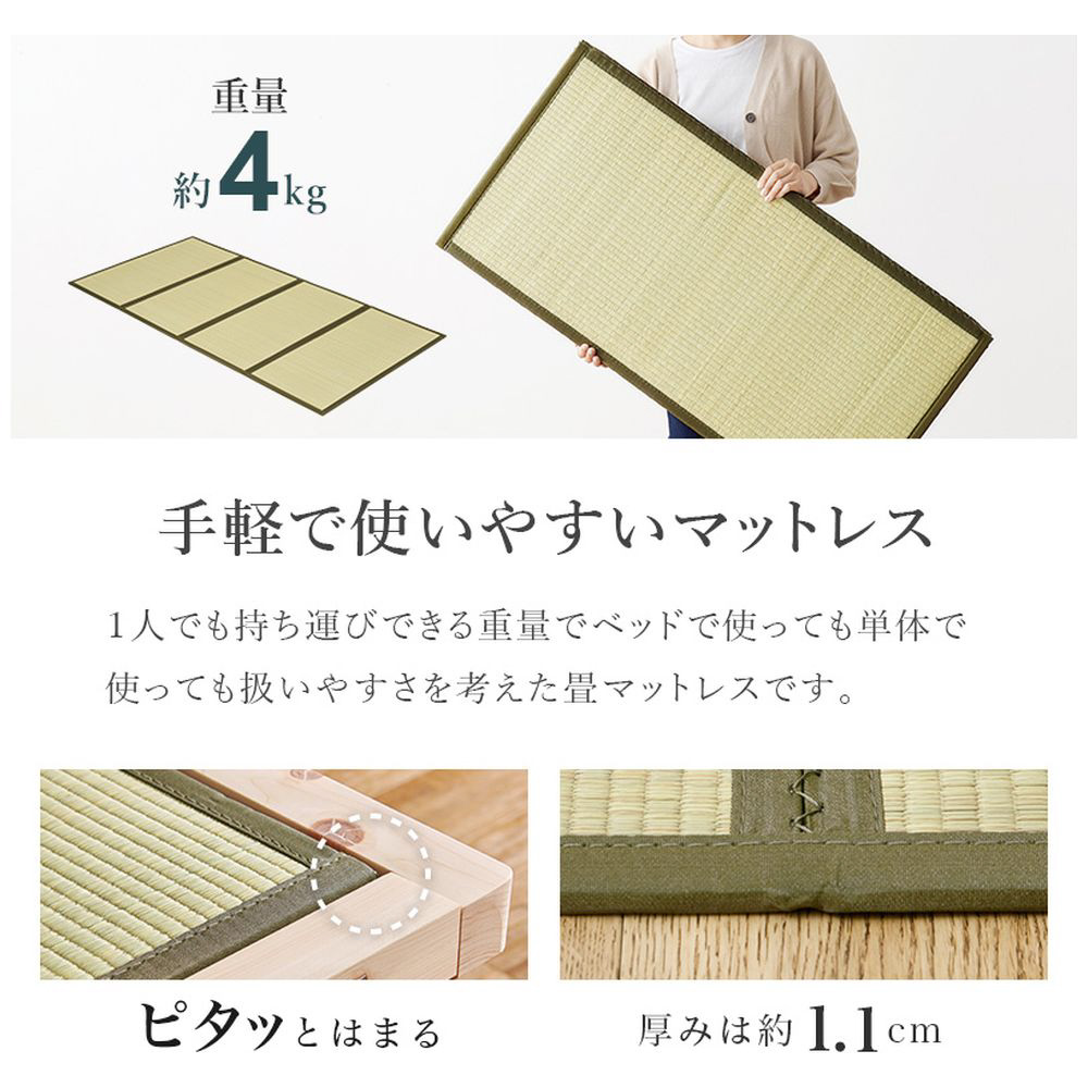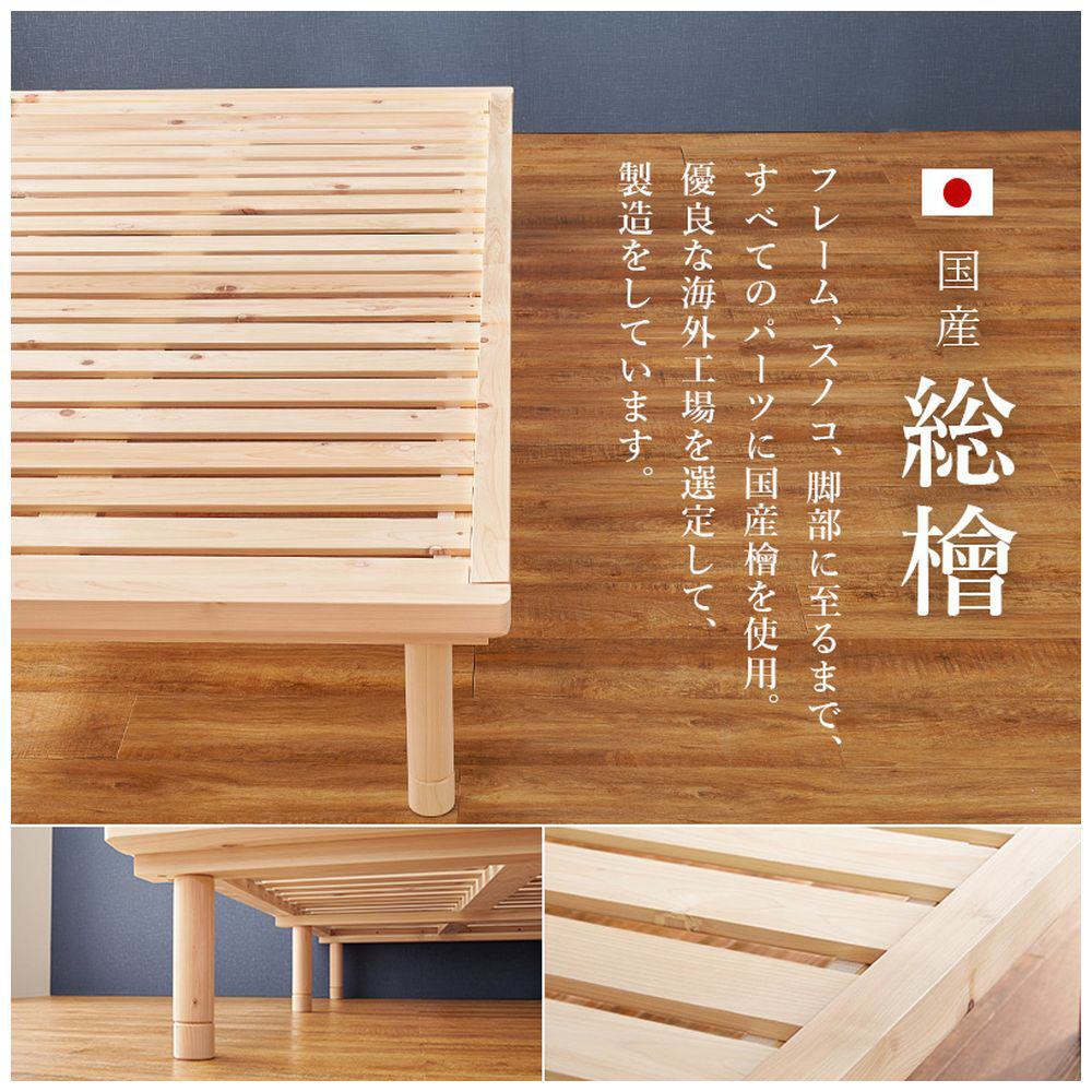 檜(ひのき)の香りや風合いを感じられるすのこベッドに爽やかな天然い草を使用した畳マットを合わせました。敷布団が使えるロングサイズで床面高さは3段階調整が可能。