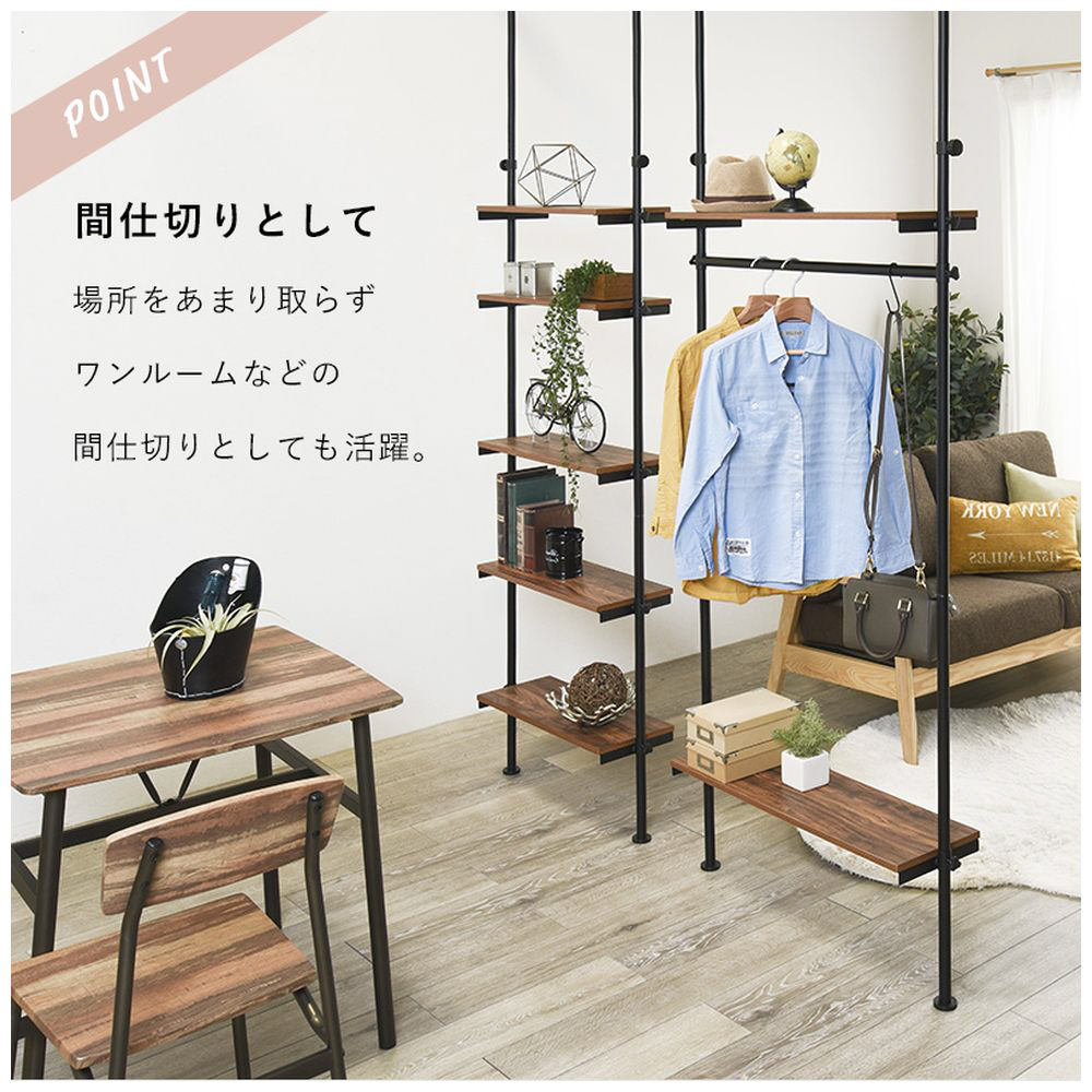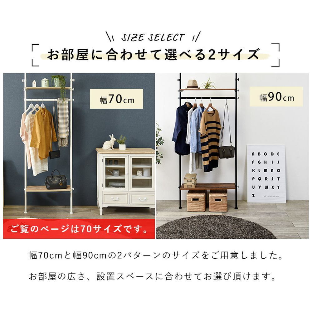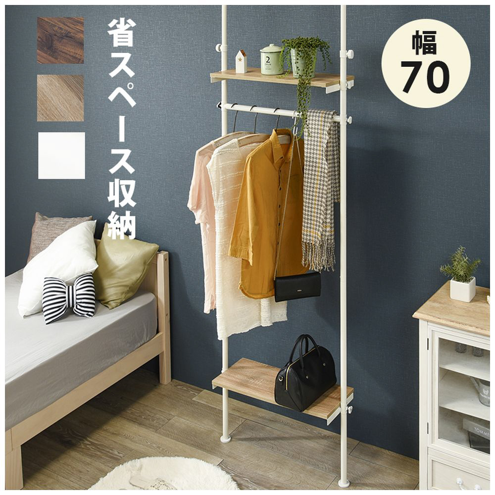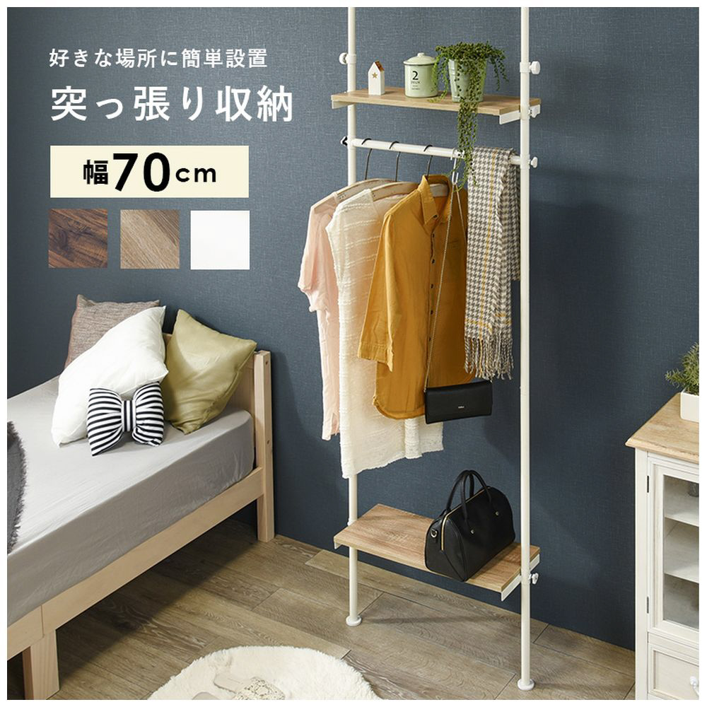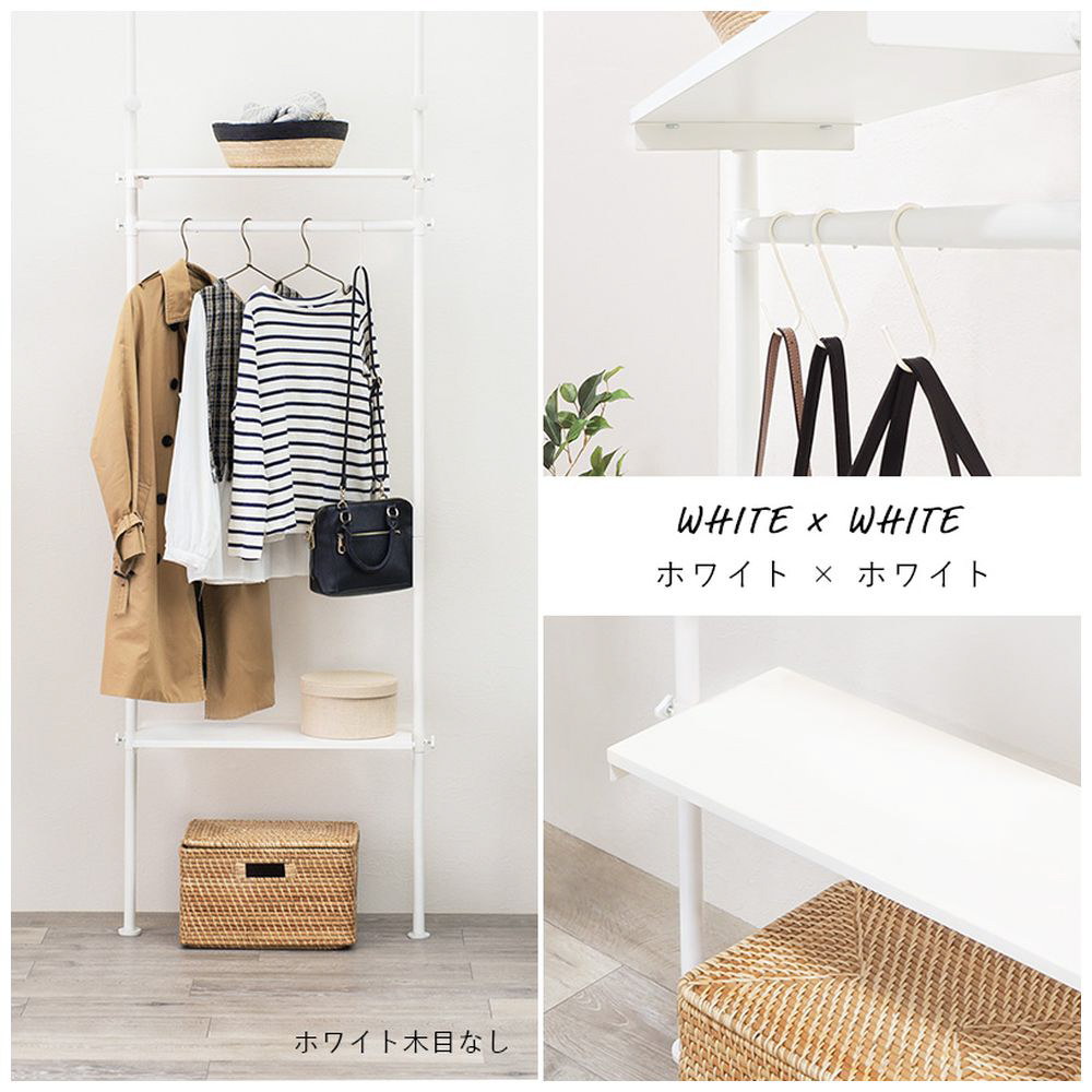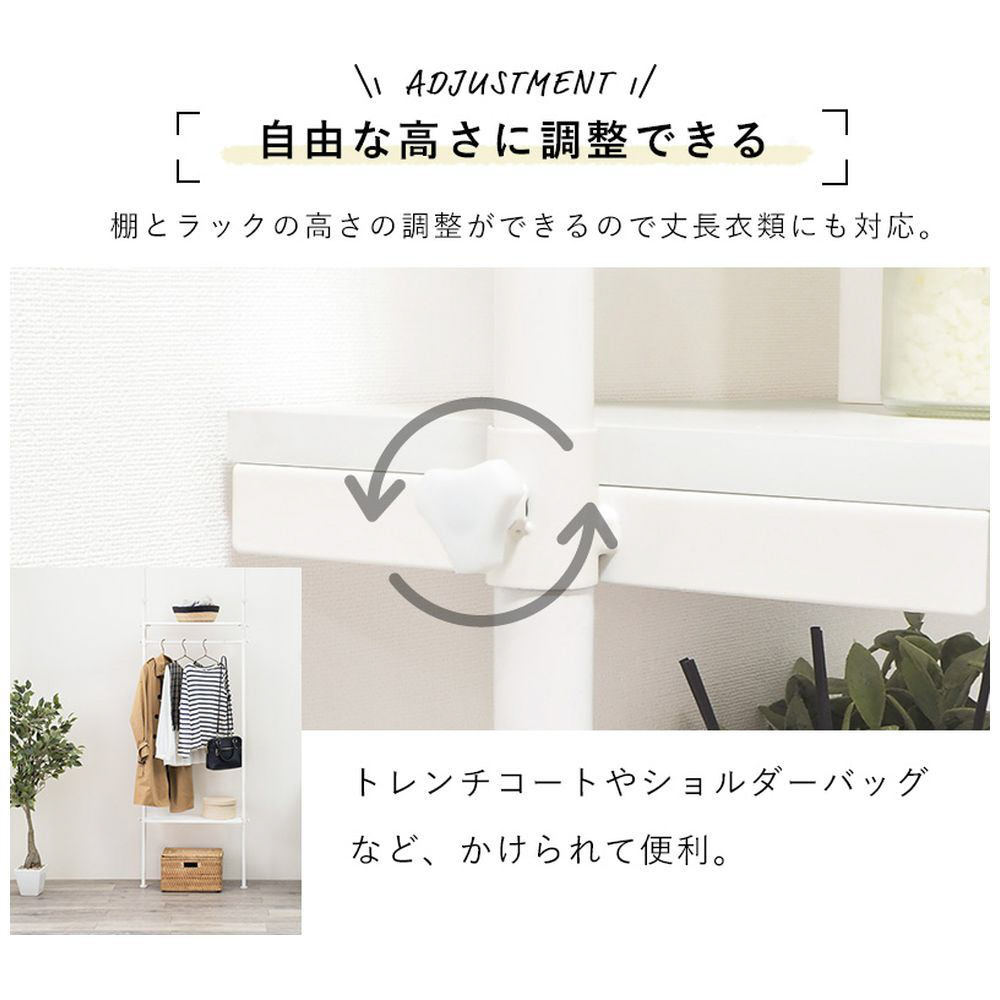 棚板とハンガーバーは無段階に高さ調節可能。スッキリ収納できるつっぱりハンガーラック。