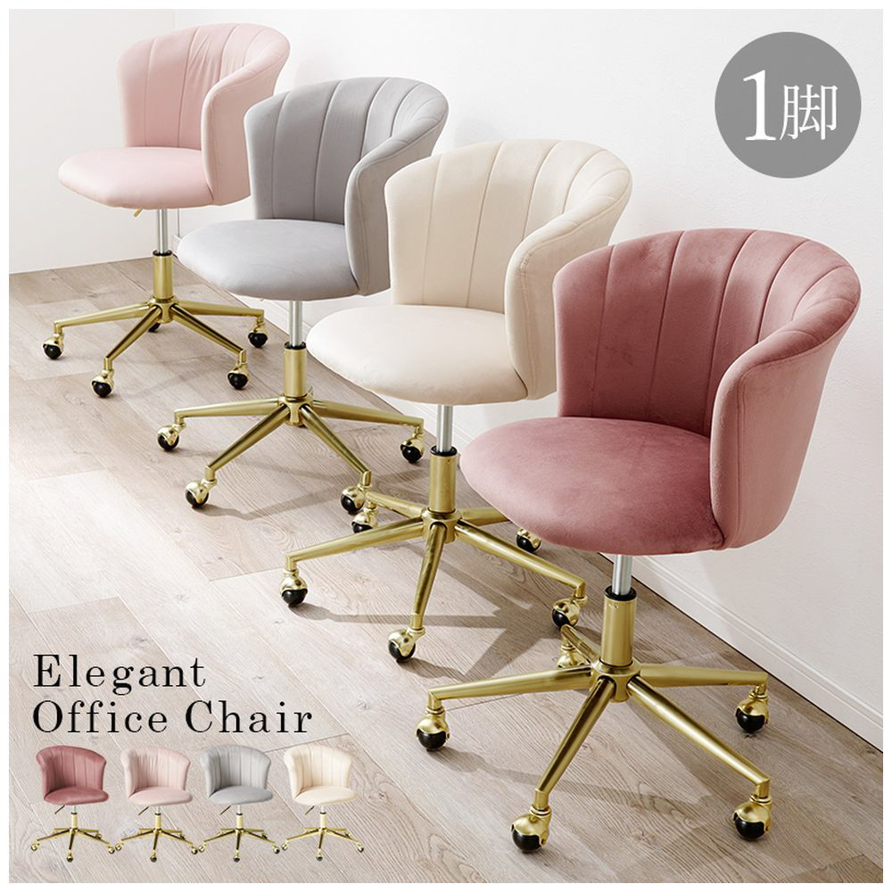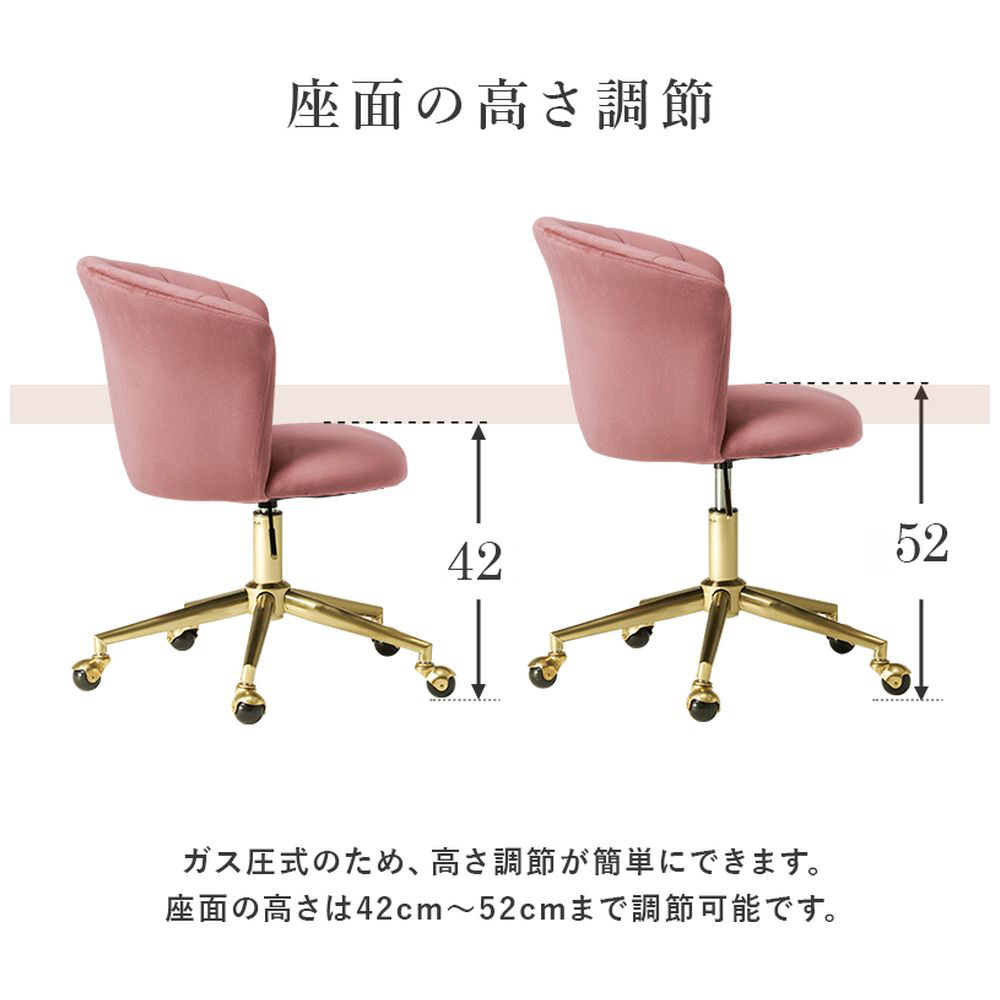 上品さを感じるゴールドの脚にベロア調生地の大人可愛い回転チェアです。キャスター付き