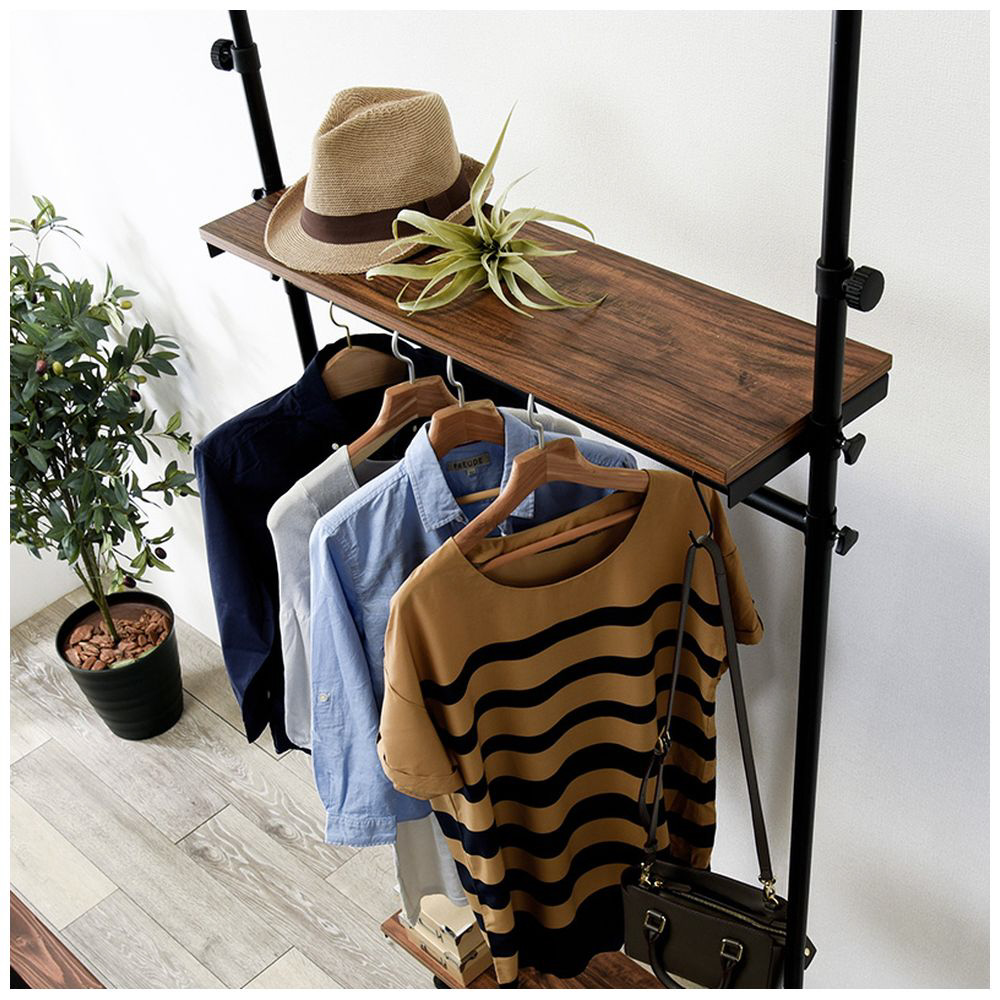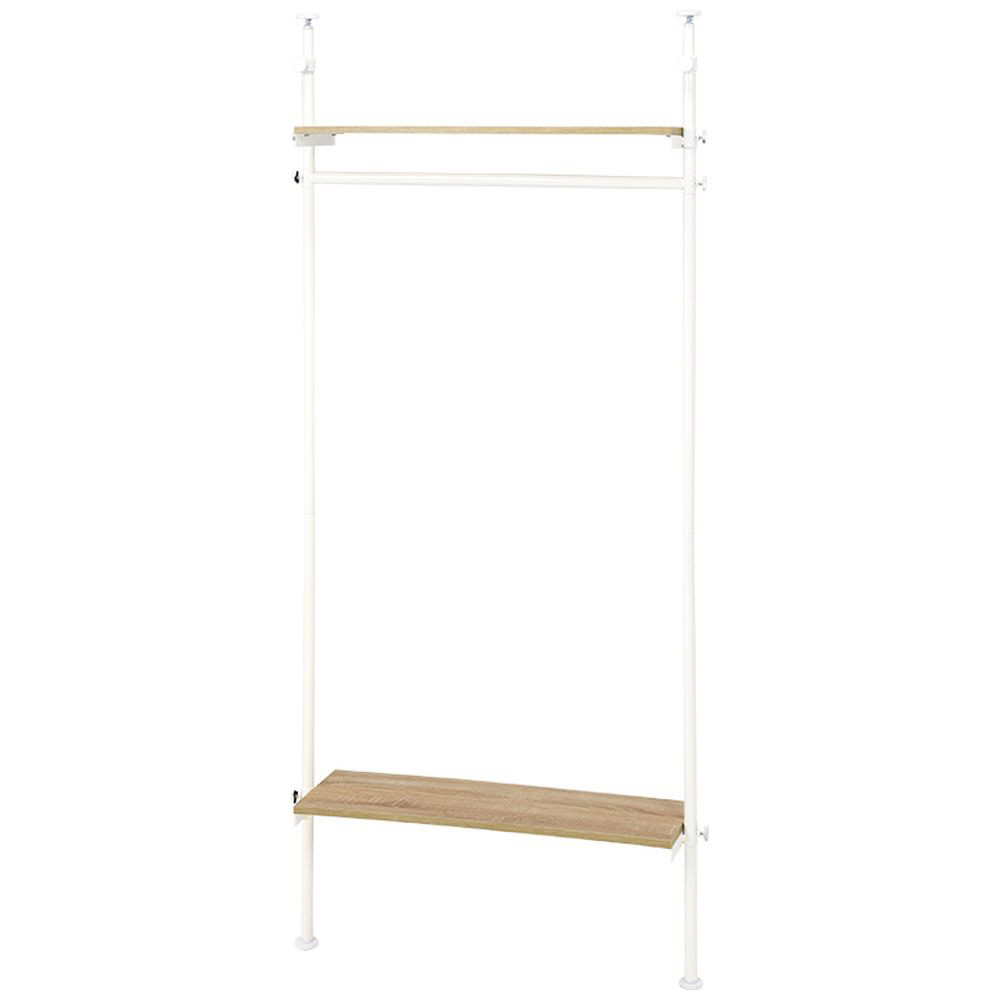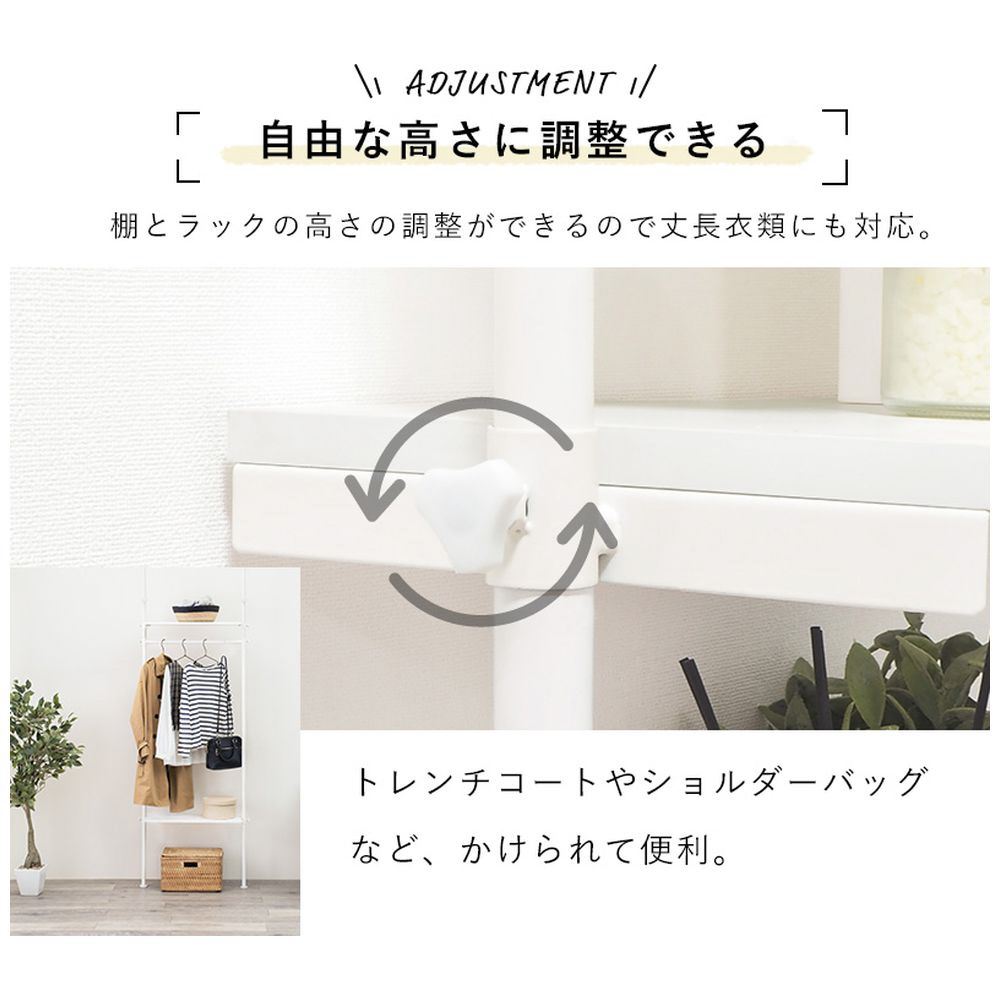 棚板とハンガーバーは無段階に高さ調節可能。スッキリ収納できるつっぱりハンガーラック。