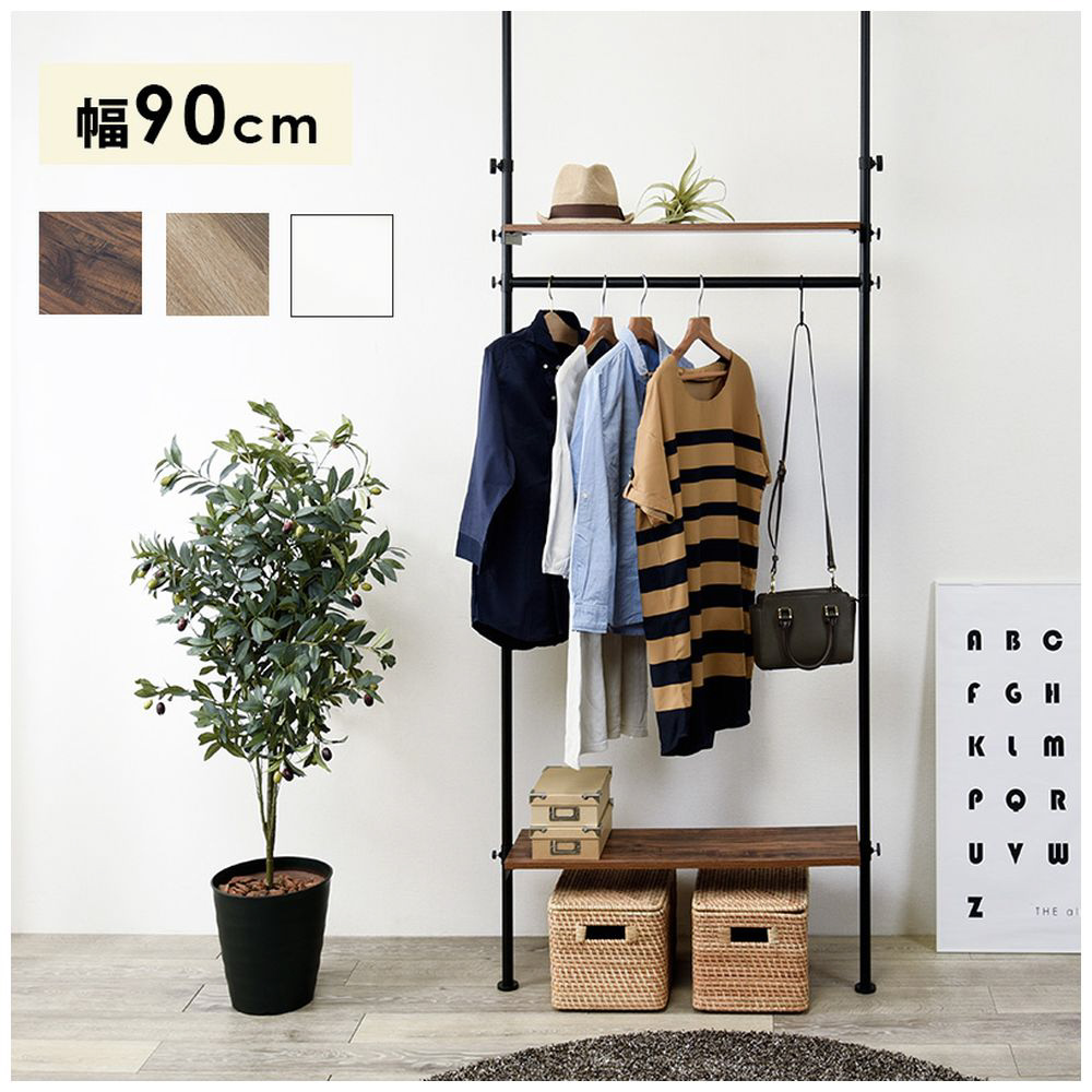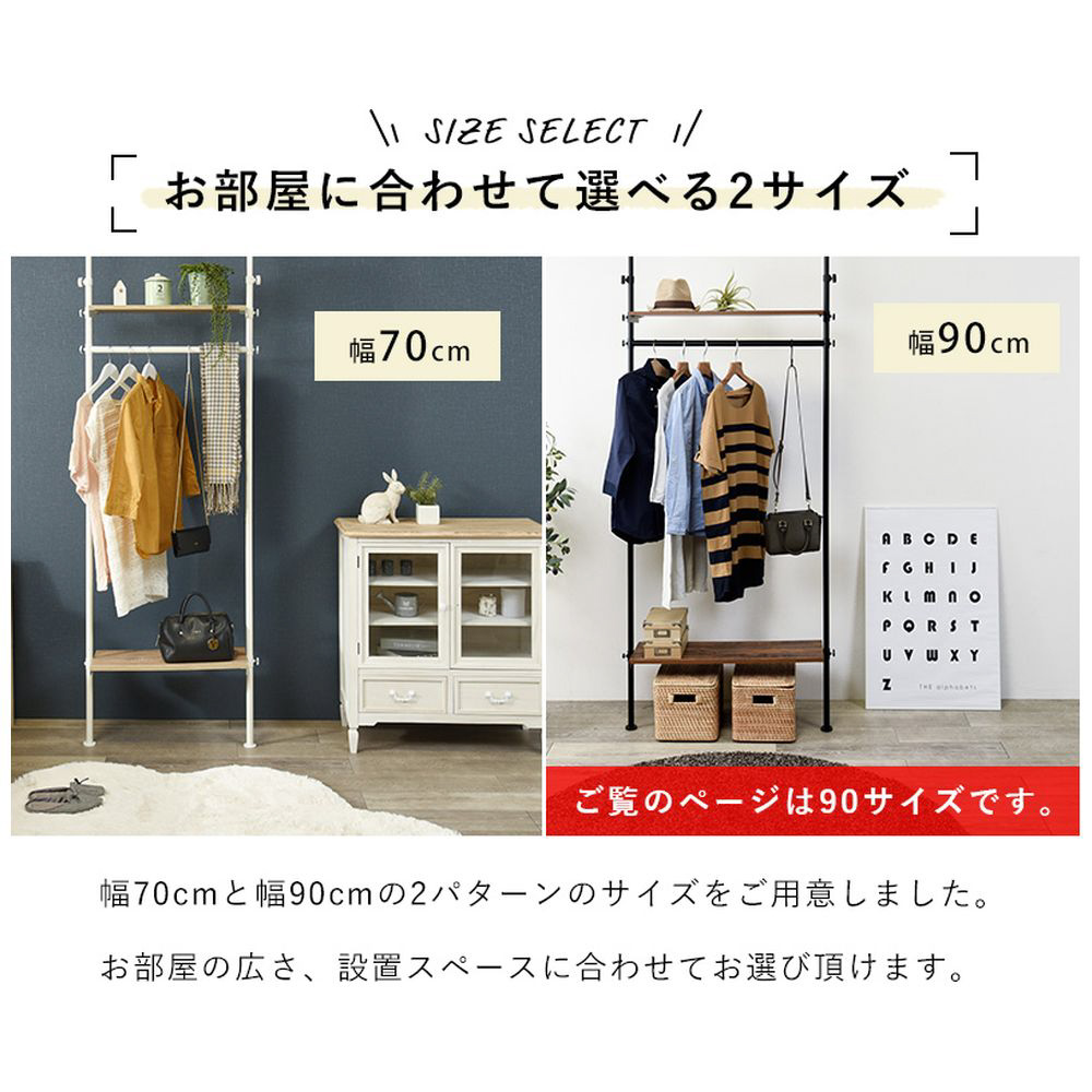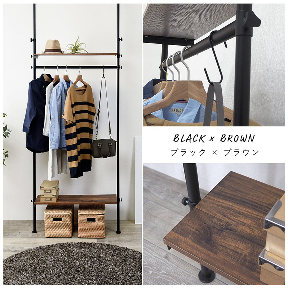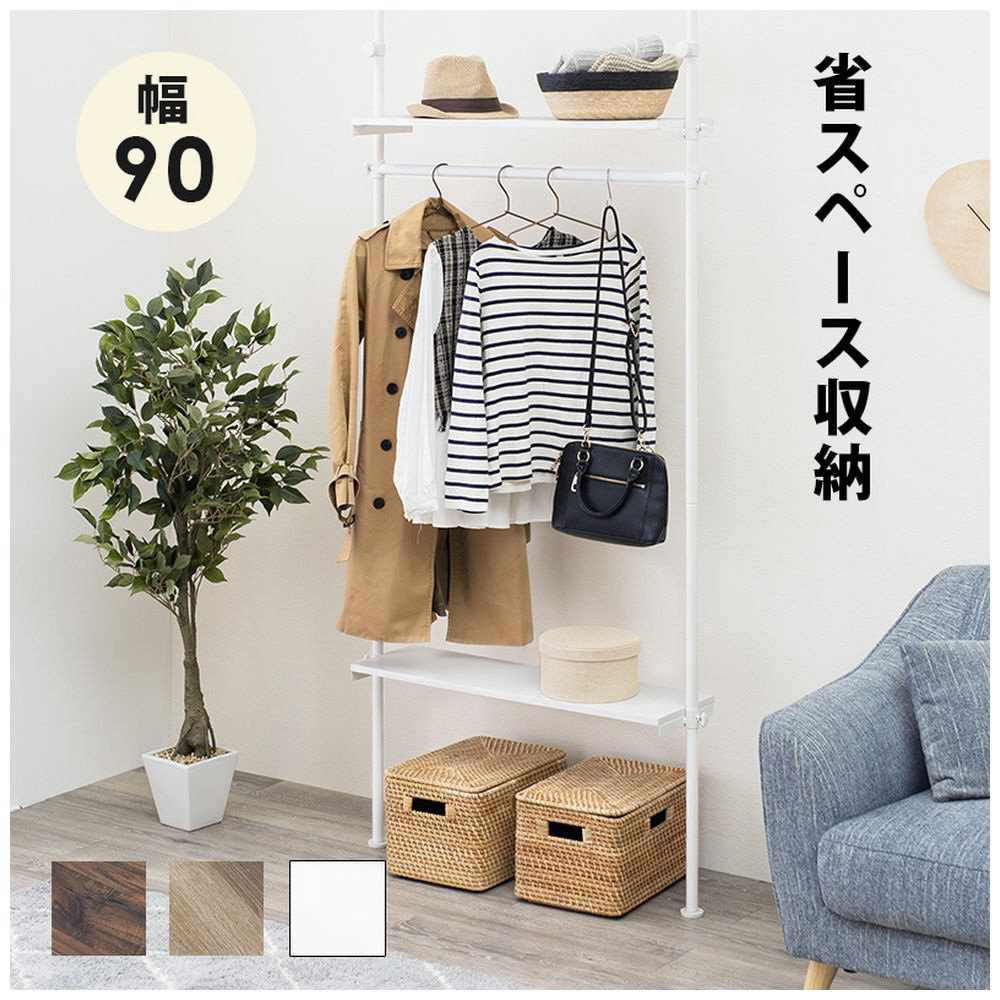 棚板とハンガーバーは無段階に高さ調節可能。スッキリ収納できるつっぱりハンガーラック。