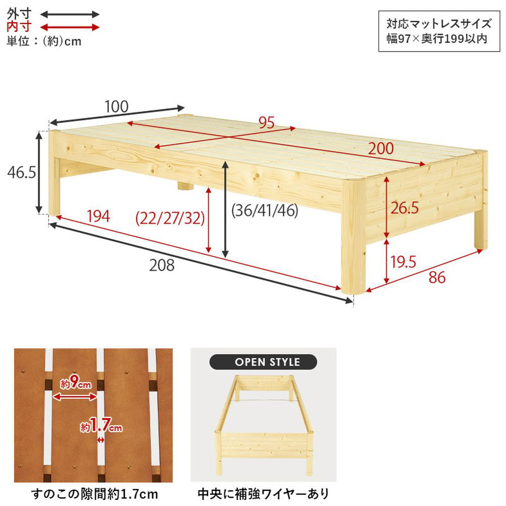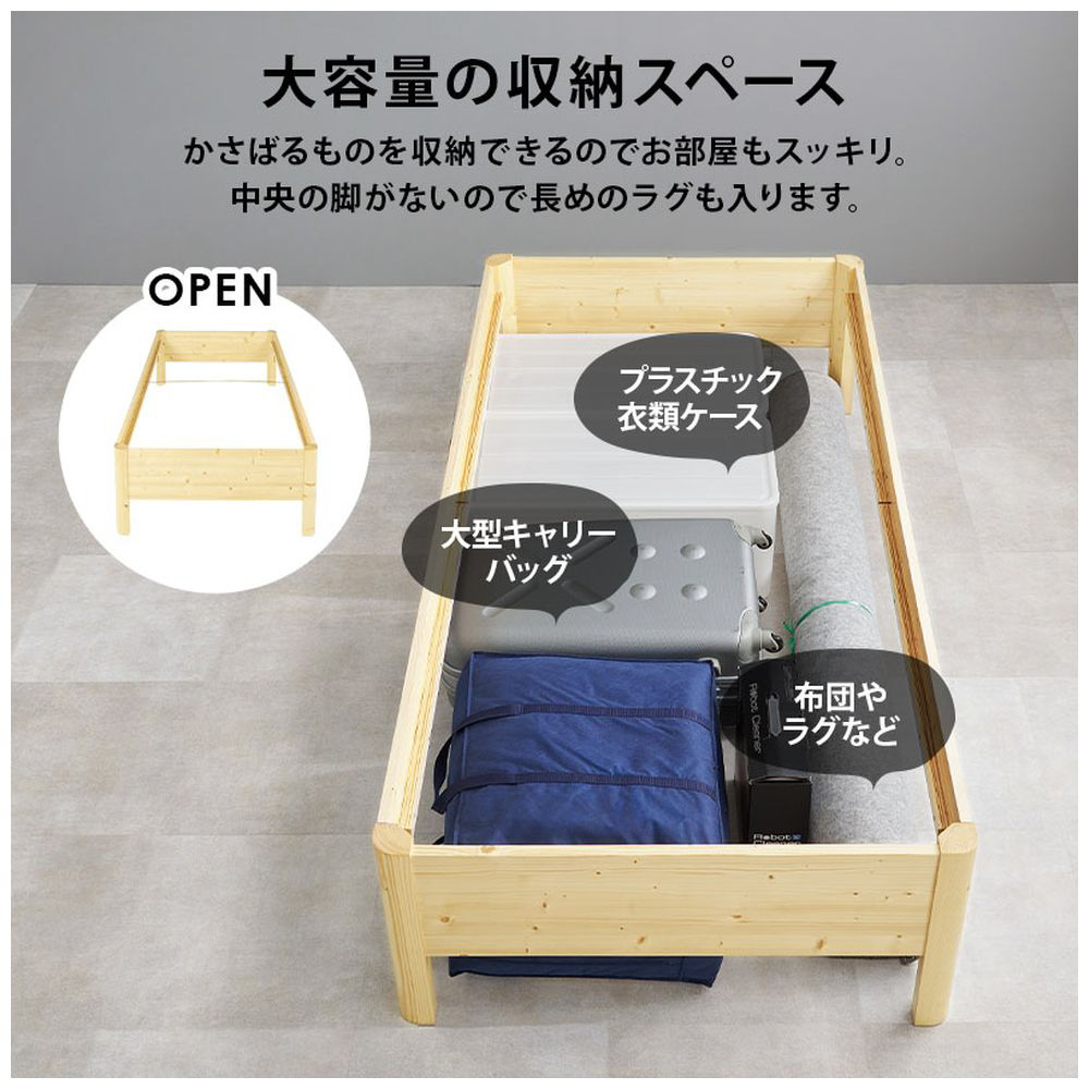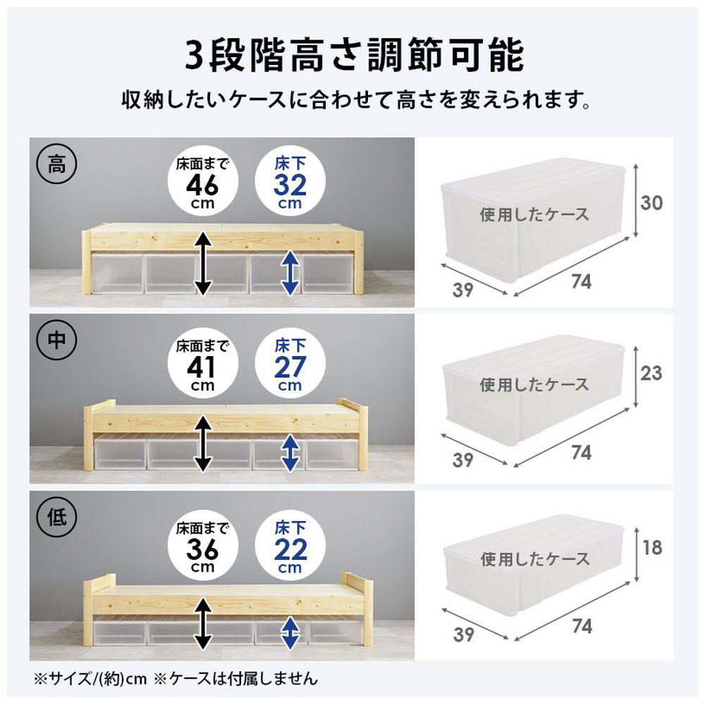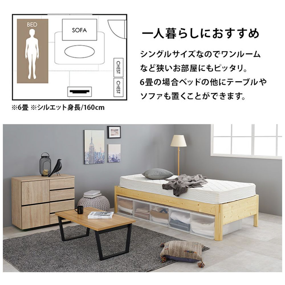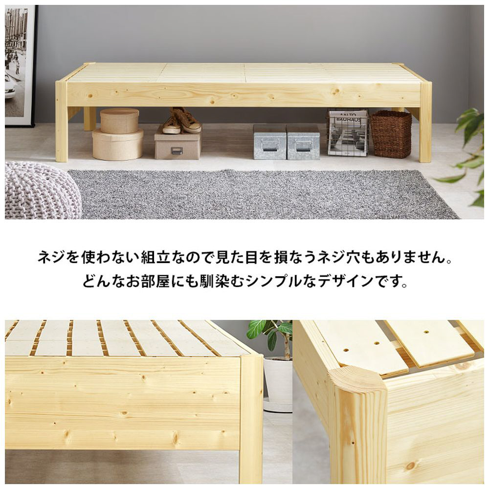 ネジなし、工具不要で簡単組立。床面高さも3段階から選べる、宮棚がなくスッキリシンプルなデザインのシングルベッド。
