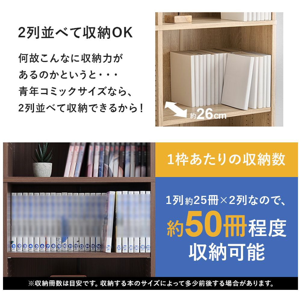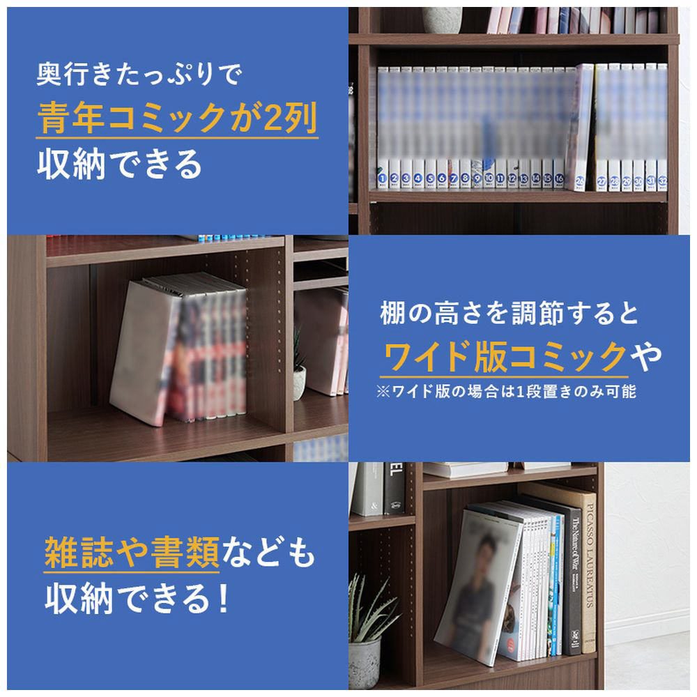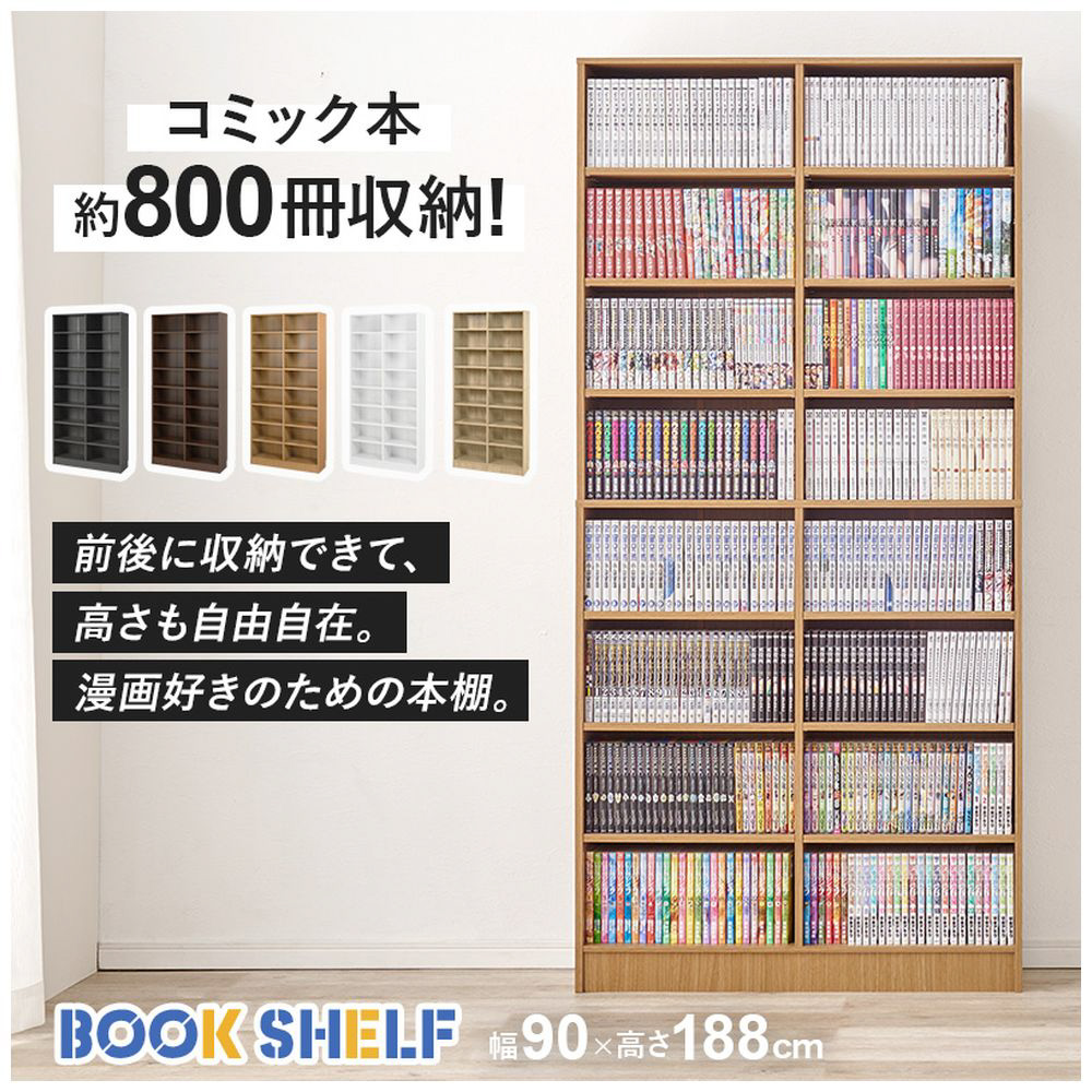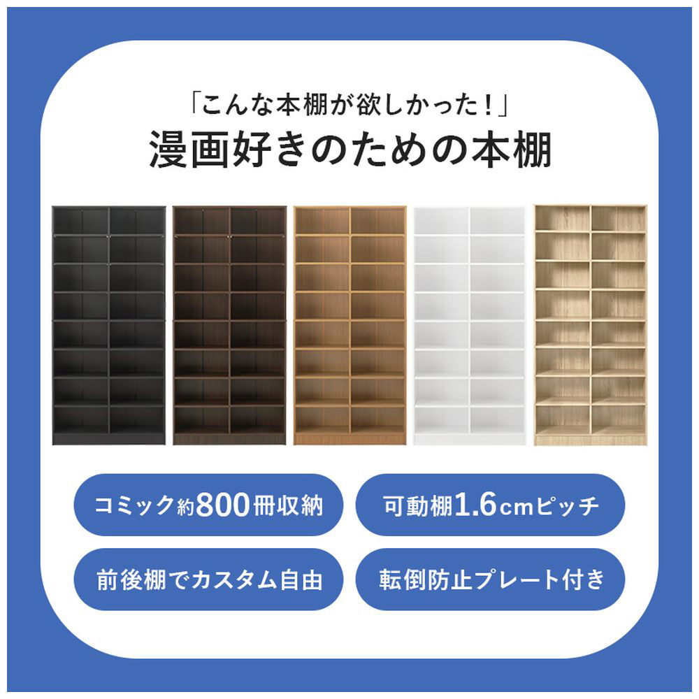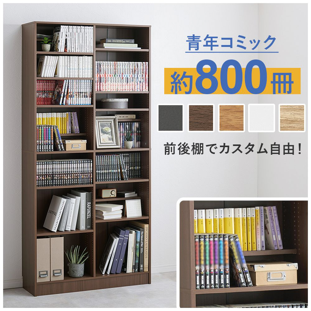 前後2列別々に棚板高さが変えられ、大容量収納できるマンガ好きの為の本棚