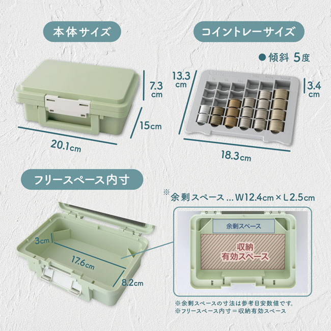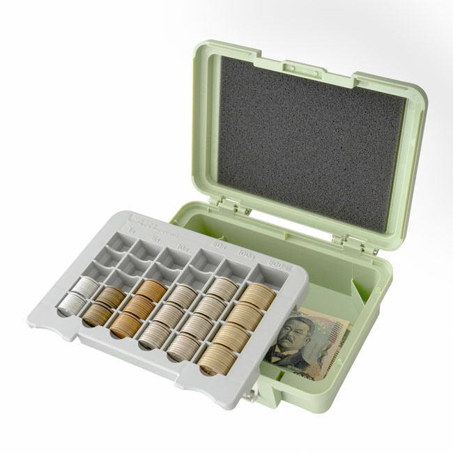 仕様1 ■サイズ:W201×L150×H73mm■重量:370g■トレー硬貨収納枚数:1円、5円、10円、50円、100円、500円各50枚■トレー下紙幣収納枚数:日本紙幣約300枚■トレー下有効スペース内寸:W176×L82×H30mm