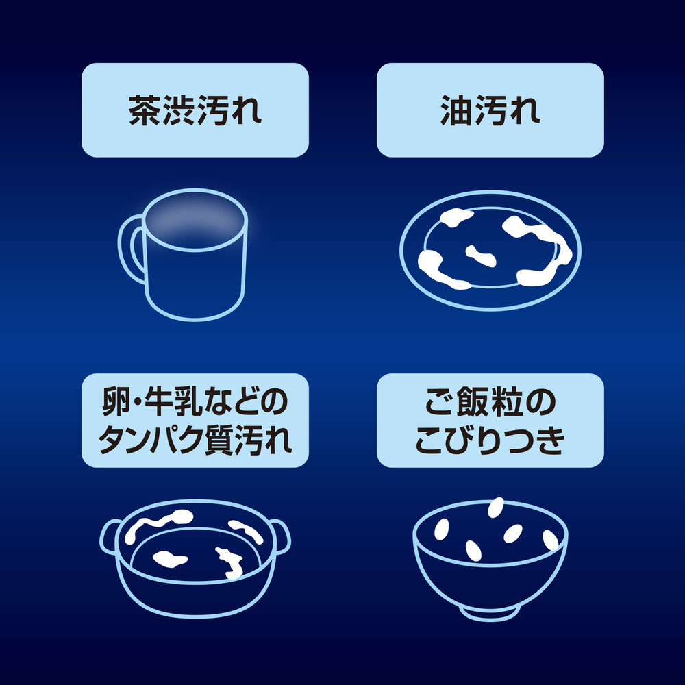 24時間放置して乾燥・こびりついたしつこい汚れでさえも、予洗いなし*でしっかり落とす!