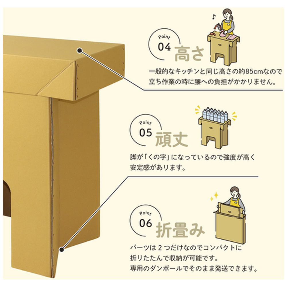 ■重さは約2〜3.7キロ。持ち手があるので一人でも軽々と持ち上げることが出来ます。約85センチの高さなので立ち作業時に腰への負担がかかりません。片面に大きめの窓が付いているので、下の空間を有効に活用できます。用途に応じて向きを使い分けてください。脚が「くの字」になっているので強度が高く、安定感があります。ダンボールは製造時のCO2排出量が少なく、環境に優しい素材です。コンパクトに折り畳み収納可能です。