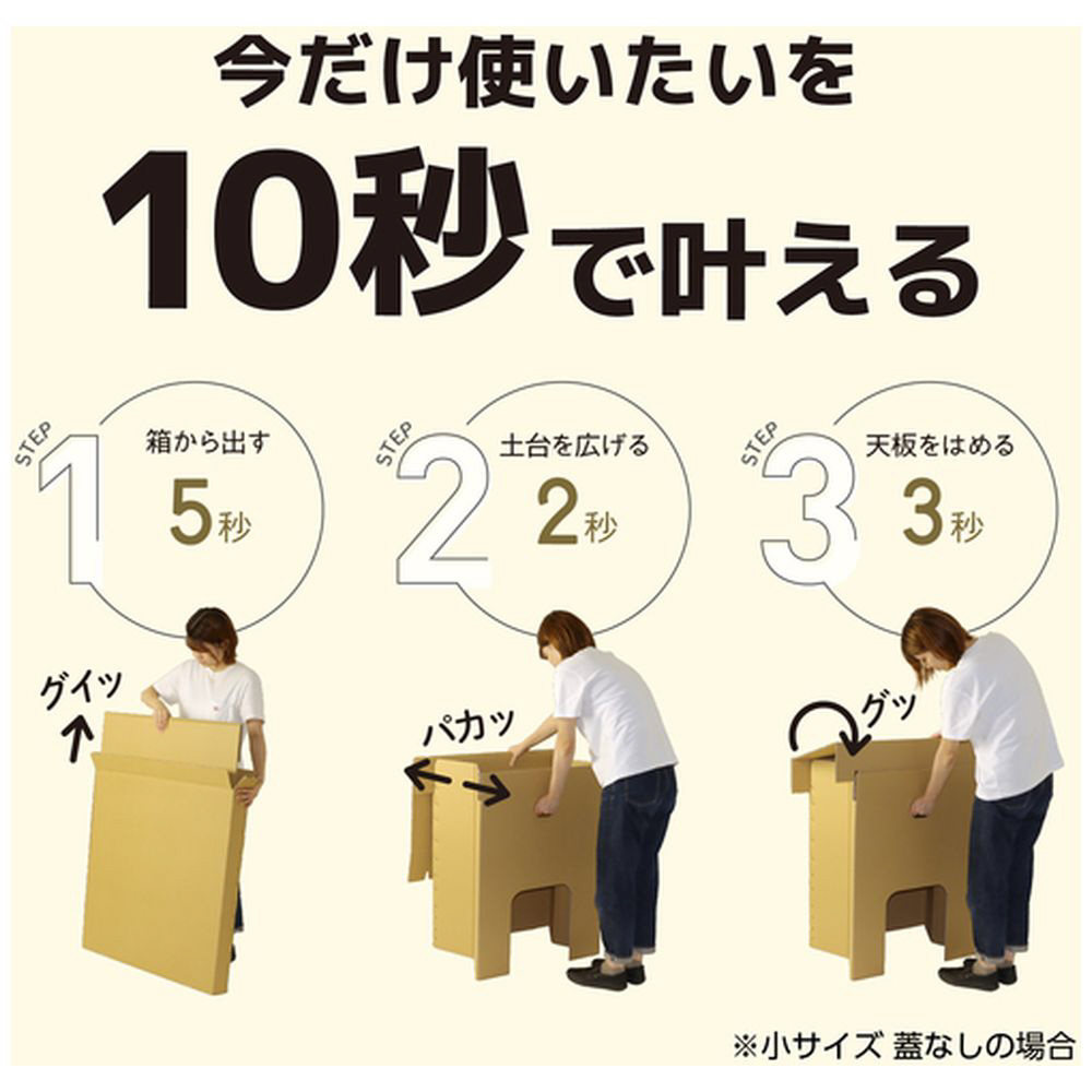 ■重さは約2〜3.7キロ。持ち手があるので一人でも軽々と持ち上げることが出来ます。約85センチの高さなので立ち作業時に腰への負担がかかりません。片面に大きめの窓が付いているので、下の空間を有効に活用できます。用途に応じて向きを使い分けてください。脚が「くの字」になっているので強度が高く、安定感があります。ダンボールは製造時のCO2排出量が少なく、環境に優しい素材です。コンパクトに折り畳み収納可能です。