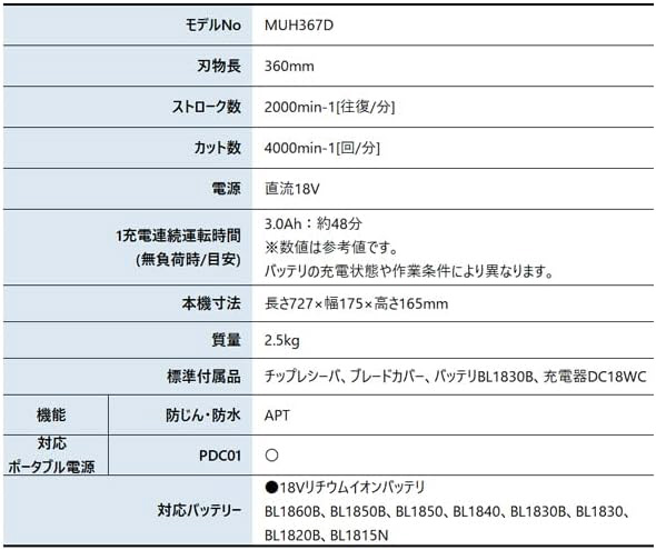 マキタ MUH367DWF 360mm充電式生垣バリカン 18V/3.0Ah (バッテリ BL1830B・充電器DC18WC付)