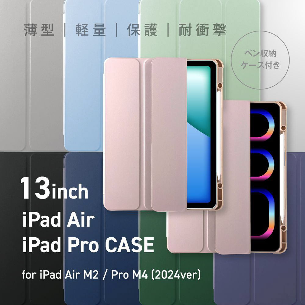 オートスリープ機能対応のiPad Air/Pro13インチ(M2/M3/M4)対応手帳型ケースです。
