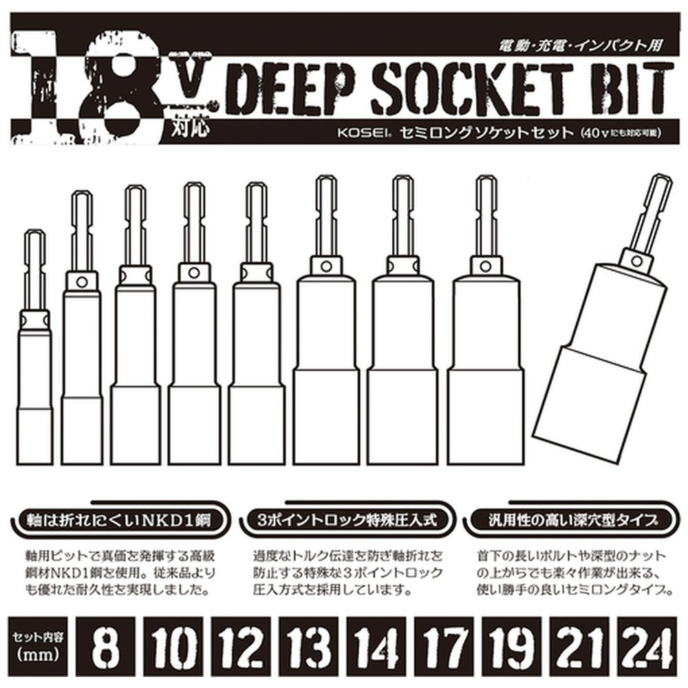 ・深穴タイプで首下の長いボルトナットに対応!高級鋼材NKD-1鋼をビット軸に採用した耐久性の高いセミロングソケットのフルサイズセット。