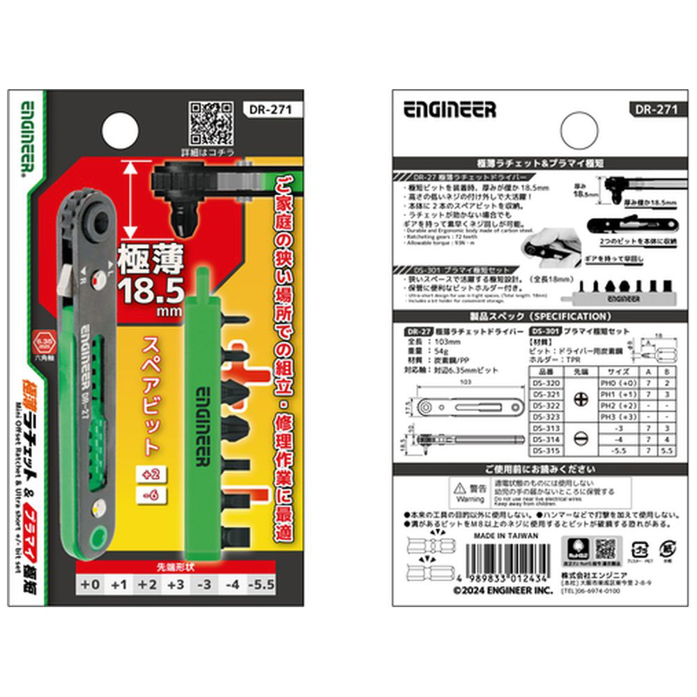 ■極薄ラチェット(DR-27)と家具や家電の組み立て、修理に便利なプラス、マイナスビット7本組(DS-401)のセット。