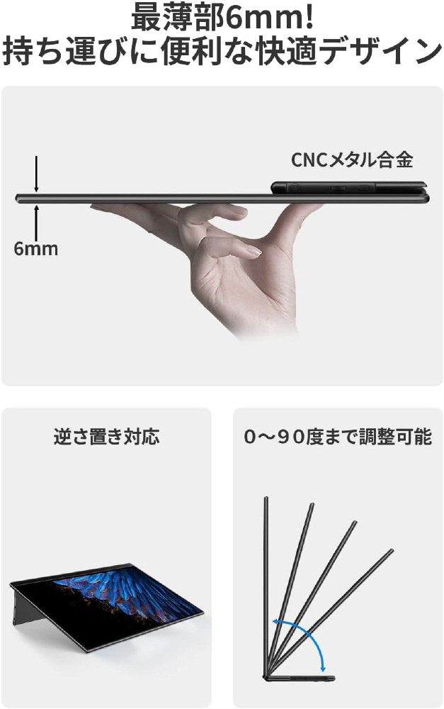最薄部は6mmで、まるでA4ノートを持ち歩く感覚でどこへでもご携帯いただけます。作業場所では場所を選ばず、付属のケーブル一本でデバイスと接続可能です。※デバイスによって電源供給が別途必要となります。バッグに入れたり、手持ちでも。ビジネスオフィス/カフェ/旅行先にも簡単に持ち運べ、あらゆるシーンで快適に使用できます。皆様の理想のライフスタイル実現の一助となること間違いありません。ボディー素材には高品質かつ丈夫なCNCメタルを使用。