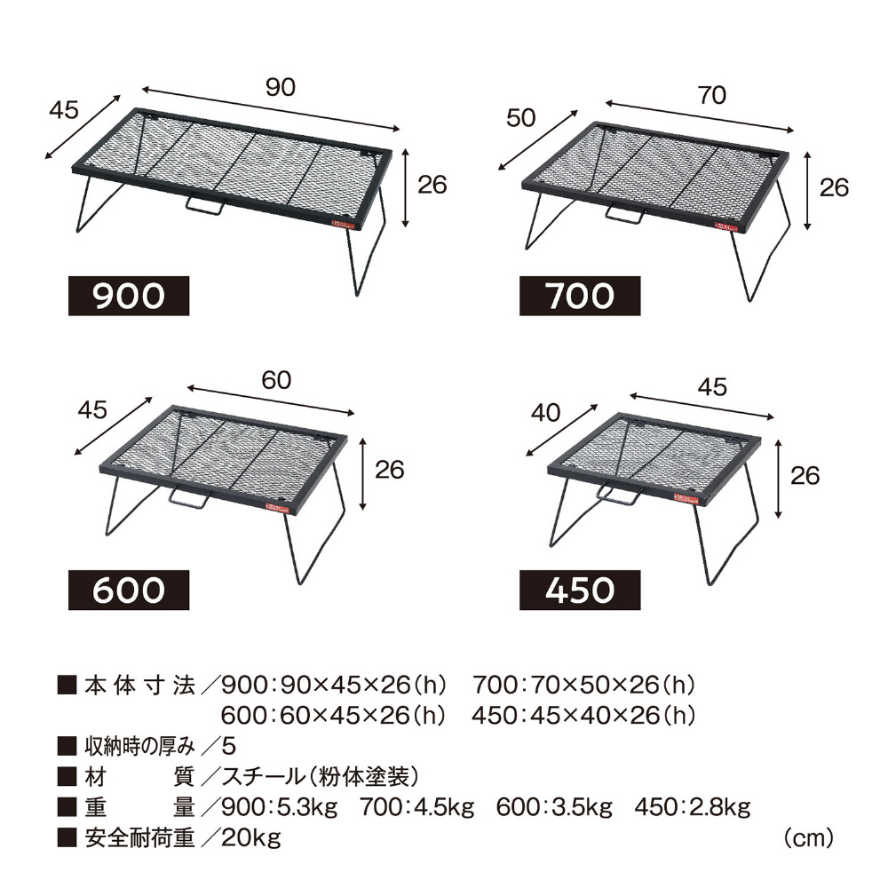 仕様:耐熱性に優れたスチール製のテーブル。溶接加工された重厚な作りがクラシック・アウトドアの雰囲気に。天板は滑りにくいハードメッシュ(ラス網)。各コーナーは溶接加工で重厚な作り。