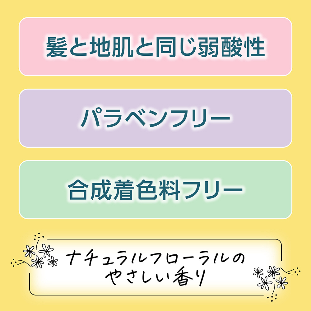 1本で地肌すこやか、髪さらさら。●うるおい成分:5つの植物由来エキス(ユーカリ・カモミラ・レンゲソウ・アスナロ・シラカバ)、フルーツ酸(リンゴ酸)配合●髪と地肌と同じ弱酸性●パラベンフリー・合成着色料フリー●リンス成分配合(毛髪保護剤):高重合ジメチコンー1●有効成分 甘草エキス(グリチルリチン酸ジカリウム)●髪と地肌をすこやかに保つ●フケ・かゆみを防ぐ(医薬部外品)
