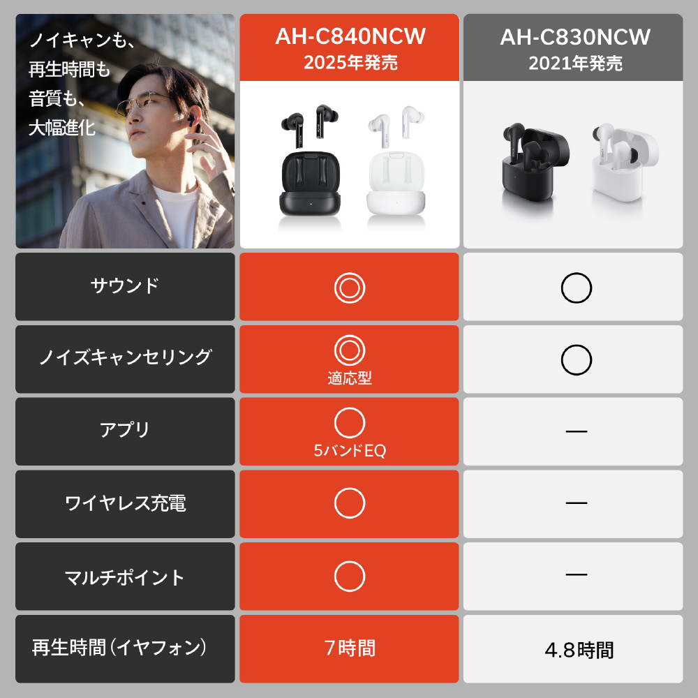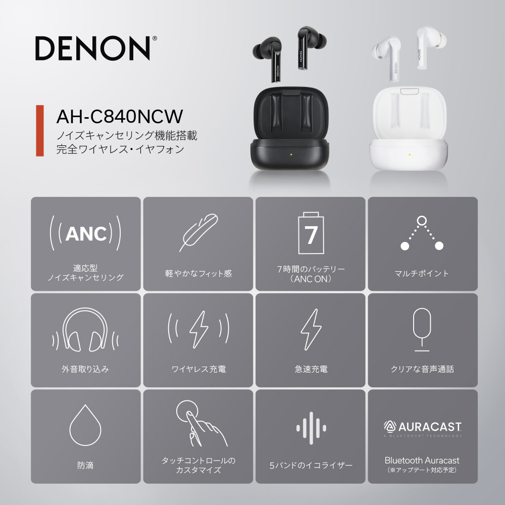 AH-C840NCW は、デノンの卓越したハイパフォーマンスサウンドを備えたノイズキャンセリング機能搭載の完全ワイヤレスイヤフォンです。