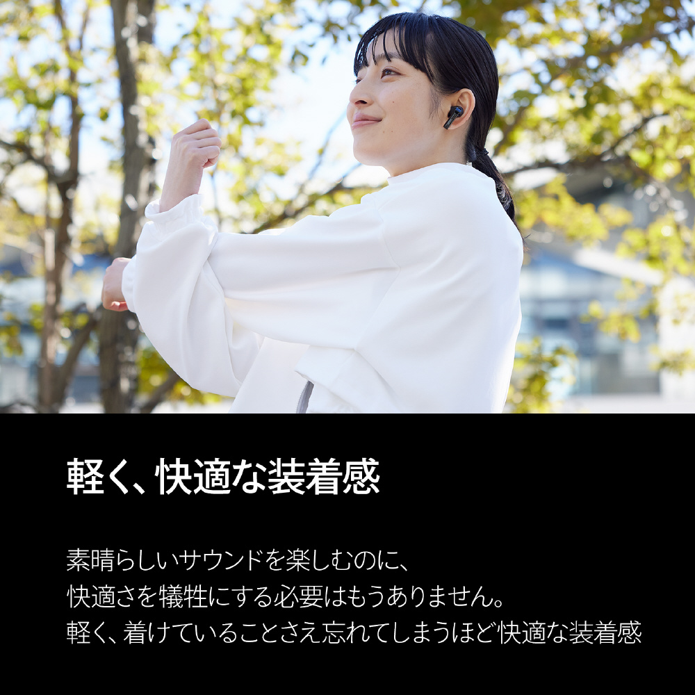 一日中着けたままでも快適な装着感と洗練されたデザイン、マルチポイント接続、安心の防滴性能、最大35 時間の再生時間を実現しています。